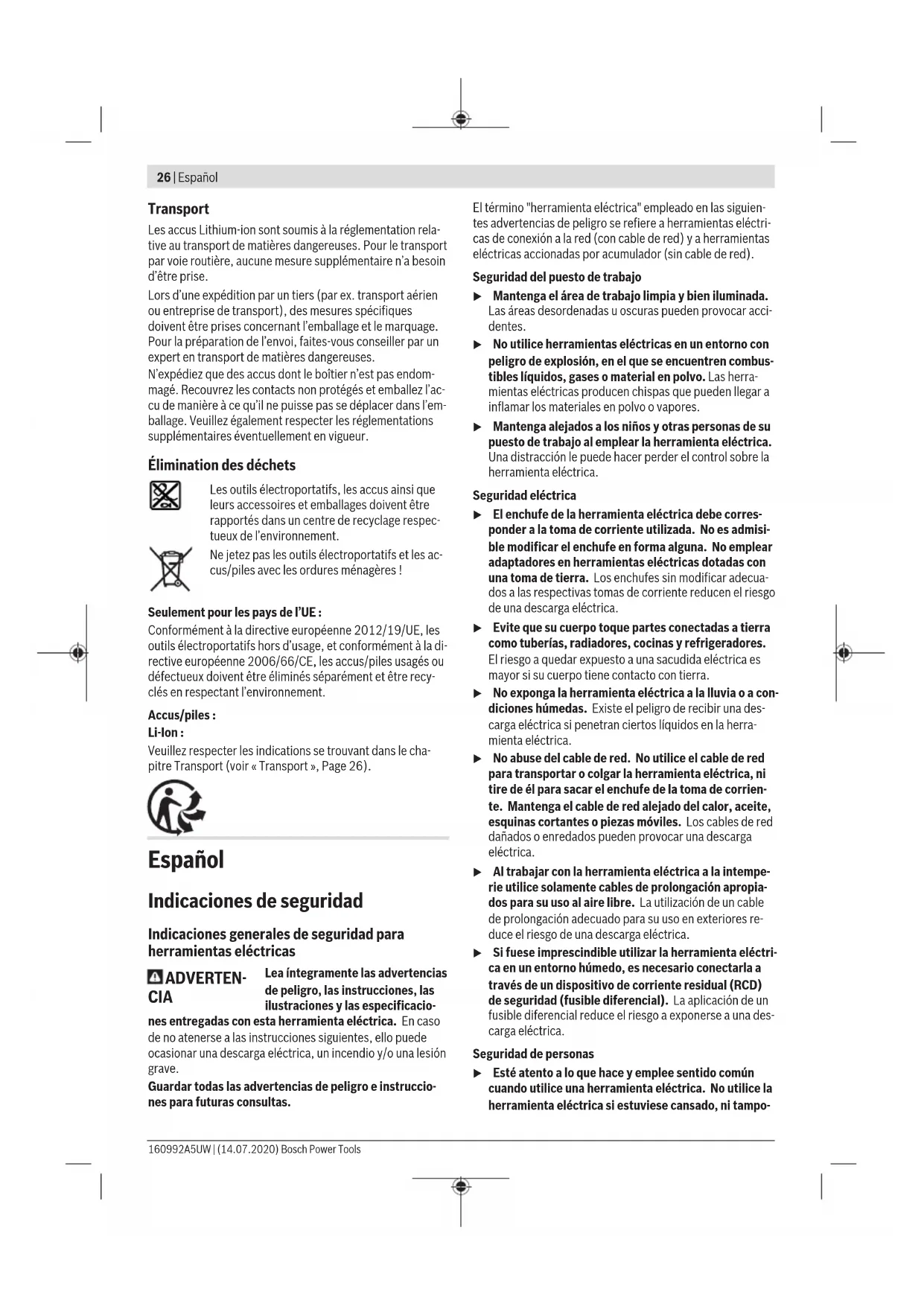 M6 2.71 3.61 4.52 4.8 5.42 6.02 7.22 8.13 9.7 13.6 16.2 M8 6.57 8.7 11 11.6 13.1 14.6 17.5 19.7 23 33 39 M10 13 17.5 22 23 26 29 35 39 47 65 78 M12 22.6 30 37.6 40 45 50 60 67 80 113 135 M14 36 48 60 65 72 79 95 107 130 180 215 M16 55 73 92 98 110 122 147 165 196 275 330 Conseils Avant de visser des vis de gros diamètre ou très longues dans des matériaux durs, il est recommandé d’effectuer un préperçage au diamètre intérieur de filetage sur approxima- tivement les 2/3 de la longueur de la vis. Remarque : Veillez à ce qu’aucune pièce métallique (pièce de fixation par ex.) ne pénètre dans l’outil électroportatif. Après avoir travaillé à une petite vitesse pendant une pé- riode relativement longue, faites tourner l’outil électroporta- tif à vide au régime maximal pendant une durée de 3minutes environ afin de le laisser refroidir. Clip de ceinture Le clip de ceinture (5) permet d’accrocher l’outil électropor- tatif à une ceinture ou autre. Vous avez donc les deux mains libres et l’outil électroportatif est à tout moment à portée de main. Indications pour l’utilisation optimale de l’accu Protégez l’accu de l’humidité et de l’eau. Ne stockez l’accu que dans la plage de températures de –20 à 50°C. Ne laissez par ex. pas l’accu dans une voiture en plein été. Une baisse notable de l’autonomie de l’accu au fil des re- charges effectuées indique que l’accu est arrivé en fin de vie et qu’il doit être remplacé. Respectez les indications concernant l’élimination. Entretien et Service après‑vente Nettoyage et entretien u Nettoyez le porte-outil (1) et la bague de verrouillage (2) de temps en temps et graissez-les légèrement avec de la graisse 1 600 A00 2NE. u Retirez l’accu de l’appareil électroportatif avant toute intervention (opérations d’entretien/de maintenance, changement d’accessoire, etc.) ainsi que lors de son transport et rangement. Il y a sinon risque de blessure lorsqu’on appuie par mégarde sur l’interrupteur Marche/ Arrêt. u Tenez toujours propres l’outil électroportatif ainsi que les fentes de ventilation afin d’obtenir un travail im- peccable et sûr. Service après-vente et conseil utilisateurs Notre Service après-vente répond à vos questions concer- nant la réparation et l’entretien de votre produit et les pièces de rechange. Vous trouverez des vues éclatées et des infor- mations sur les pièces de rechange sur le site : www.bosch- pt.com L’équipe de conseil utilisateurs Bosch se tient à votre dispo- sition pour répondre à vos questions concernant nos pro- duits et leurs accessoires. Pour toute demande de renseignement ou toute commande de pièces de rechange, précisez impérativement la réfé- rence à 10chiffres figurant sur l’étiquette signalétique du produit. France Réparer un outil Bosch n’a jamais été aussi simple, et ce, en moins de 5 jours, grâce à SAV DIRECT, notre formulaire de retour en ligne que vous trouverez sur notre site internet www.bosch-pt.fr à la rubrique Services. Vous y trouverez également notre boutique de pièces détachées en ligne où vous pouvez passer directement vos commandes. Vous êtes un utilisateur, contactez : Le Service Clientèle Bosch Outillage Electroportatif Tel.: 0970821226 (Numéro non surtaxé au prix d'un ap- pel local) E-Mail : sav.outillage-electroportatif@fr.bosch.com Vous êtes un revendeur, contactez : Robert Bosch (France) S.A.S. Service Après-Vente Electroportatif 126, rue de Stalingrad 93705 DRANCY Cédex Tel. : (01) 43119006 E-Mail : sav-bosch.outillage@fr.bosch.com Vous trouverez d'autres adresses du service après-vente sous: www.bosch-pt.com/serviceaddresses Bosch Power Tools 160992A5UW | (14.07.2020)26 | Español Transport Les accus Lithium-ion sont soumis à la réglementation rela- tive au transport de matières dangereuses. Pour le transport par voie routière, aucune mesure supplémentaire n’a besoin d’être prise. Lors d’une expédition par un tiers (parex.transport aérien ou entreprise de transport), des mesures spécifiques doivent être prises concernant l’emballage et le marquage. Pour la préparation de l’envoi, faites-vous conseiller par un expert en transport de matières dangereuses. N’expédiez que des accus dont le boîtier n’est pas endom- magé. Recouvrez les contacts non protégés et emballez l’ac- cu de manière à ce qu’il ne puisse pas se déplacer dans l’em- ballage. Veuillez également respecter les réglementations supplémentaires éventuellement en vigueur. Élimination des déchets Les outils électroportatifs, les accus ainsi que leurs accessoires et emballages doivent être rapportés dans un centre de recyclage respec- tueux de l’environnement. Ne jetez pas les outils électroportatifs et les ac- cus/piles avec les ordures ménagères ! Seulement pour les pays de l’UE: Conformément à la directive européenne 2012/19/UE, les outils électroportatifs hors d’usage, et conformément à la di- rective européenne 2006/66/CE, les accus/piles usagés ou défectueux doivent être éliminés séparément et être recy- clés en respectant l’environnement. Accus/piles : Li-Ion : Veuillez respecter les indications se trouvant dans le cha- pitre Transport (voir «Transport», Page26). Español Indicaciones de seguridad Indicaciones generales de seguridad para herramientas eléctricas ADVERTEN- CIA Lea íntegramente las advertencias de peligro, las instrucciones, las ilustraciones y las especificacio- nes entregadas con esta herramienta eléctrica. En caso de no atenerse a las instrucciones siguientes, ello puede ocasionar una descarga eléctrica, un incendio y/o una lesión grave. Guardar todas las advertencias de peligro e instruccio- nes para futuras consultas. El término "herramienta eléctrica" empleado en las siguien- tes advertencias de peligro se refiere a herramientas eléctri- cas de conexión a la red (con cable de red) y a herramient