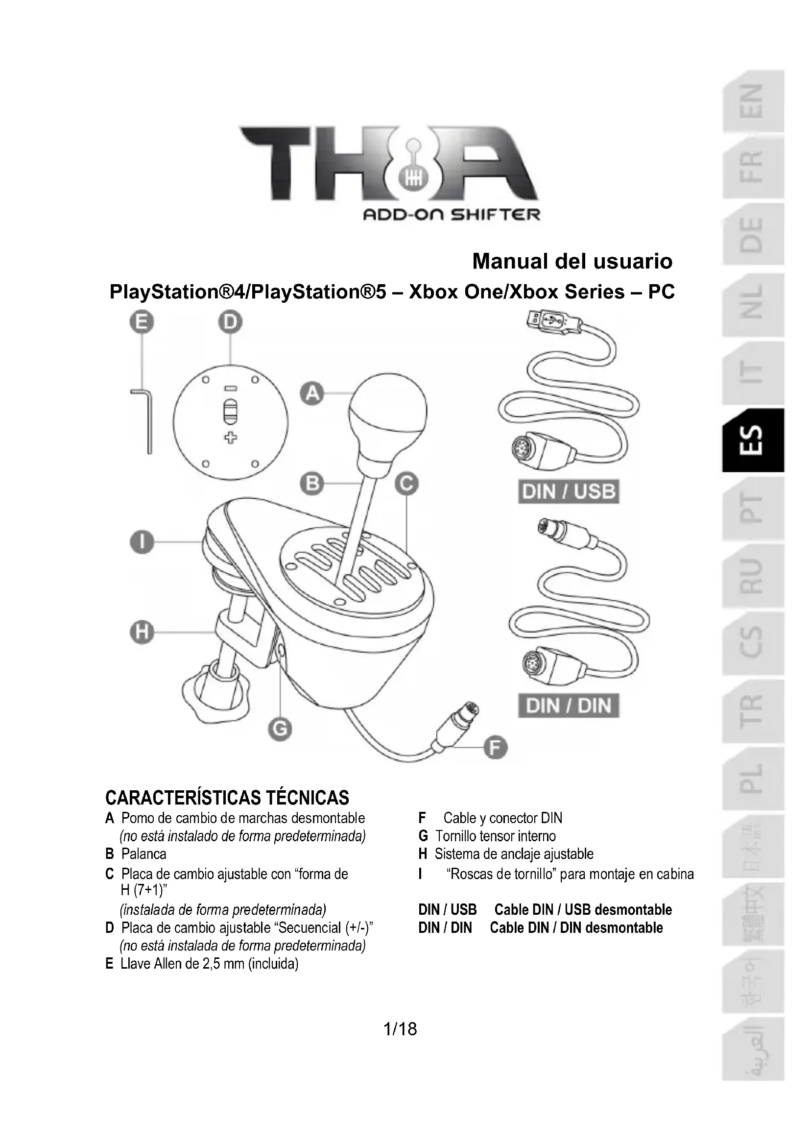 A Pomo de cambio de marchas desmontable (no está instalado de forma predeterminada) B Palanca C Placa de cambio ajustable con “forma de H (7+1)” (instalada de forma predeterminada) D Placa de cambio ajustable “Secuencial (+/-)” (no está instalada de forma predeterminada) E Llave Allen de 2,5 mm (incluida) F Cable y conector DIN G Tornillo tensor interno H Sistema de anclaje ajustable I “Roscas de tornillo” para montaje en cabina DIN / USB Cable DIN / USB desmontable DIN / DIN Cable DIN / DIN desmontable2/18 AVISO Antes de utilizar este producto, asegúrate de leer detenidamente este manual. Conserva este manual para consultarlo en el futuro. Advertencia – Descarga eléctrica