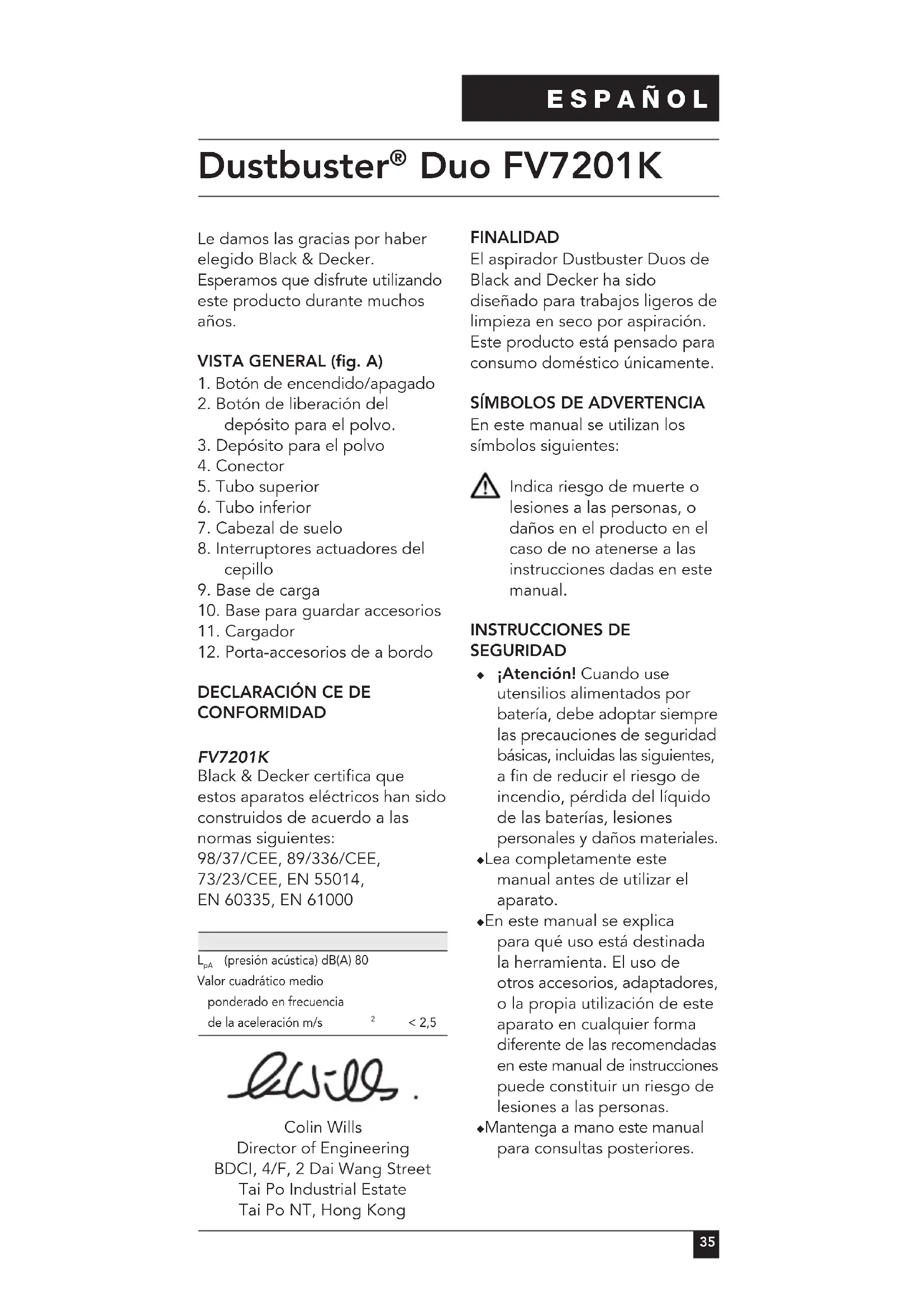 (presión acústica) dB(A) 80Valor cuadrático medioponderado en frecuenciade la aceleración m/s < 2,5 Colin Wills Director of Engineering BDCI, 4/F, 2 Dai Wang Street Tai Po Industrial Estate Tai Po NT, Hong Kong FINALIDAD El aspirador Dustbuster Duos de Black and Decker ha sido diseñado para trabajos ligeros de limpieza en seco por aspiración. Este producto está pensado para consumo doméstico únicamente.