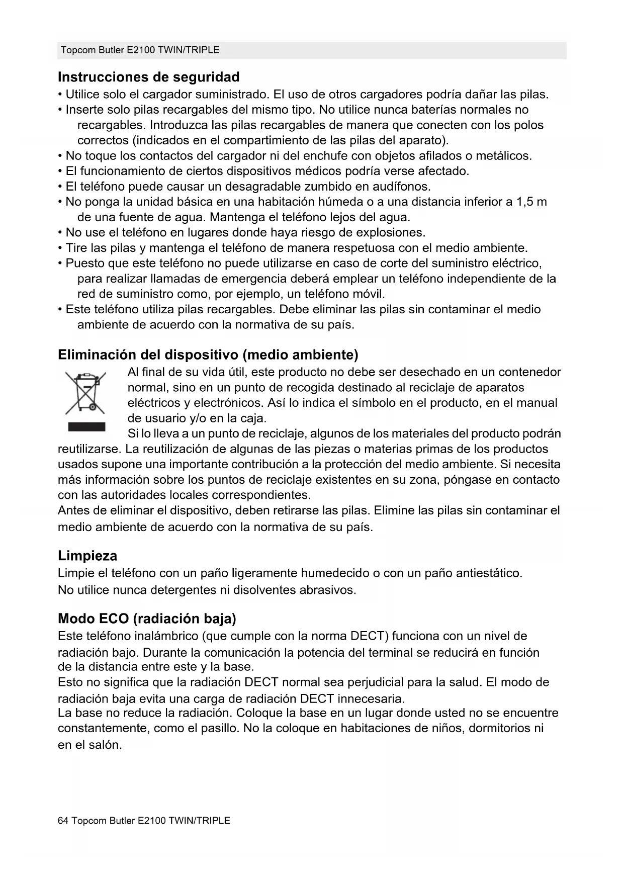 - Este teléfono utiliza pilas recargables. Debe eliminar las pilas sin contaminar el medio ambiente de acuerdo con la normativa de su país. Eliminación del dispositivo (medio ambiente) Al final de su vida útil, este producto no debe ser desechado en un contenedor normal, sino en un punto de recogida destinado al reciclaje de aparatos eléctricos y electrónicos. Así lo indica el símbolo en el producto, en el manual de usuario y/o en la caja. Si lo lleva a un punto de reciclaje, algunos de los materiales del producto podrán reutilizarse. La reutilización de algunas de las piezas o materias primas de los productos usados supone una importante contribución a la protección del medio ambiente. Si necesita más información sobre los puntos de reciclaje existentes en su zona, póngase en contacto con las autoridades locales correspondientes. Antes de eliminar el dispositivo, deben retirarse las pilas. Elimine las pilas sin contaminar el medio ambiente de acuerdo con la normativa de su país. Limpieza Limpie el teléfono con un paño ligeramente humedecido o con un paño antiestático. No utilice nunca detergentes ni disolventes abrasivos. Modo ECO (radiación baja) Este teléfono inalámbrico (que cumple con la norma DECT) funciona con un nivel de radiación bajo. Durante la comunicación la potencia del terminal se reducirá en función de la distancia entre este y la base. Esto no significa que la radiación DECT normal sea perjudicial para la salud. El modo de radiación baja evita una carga de radiación DECT innecesaria. La base no reduce la radiación. Coloque la base en un lugar donde usted no se encuentre constantemente, como el pasillo. No la coloque en habitaciones de niños, dormitorios ni en el salón.Topcom Butler E2100 TWIN/TRIPLE 65Topcom Butler E2100 TWIN/TRIPLE ESPAÑOL 1 Botones