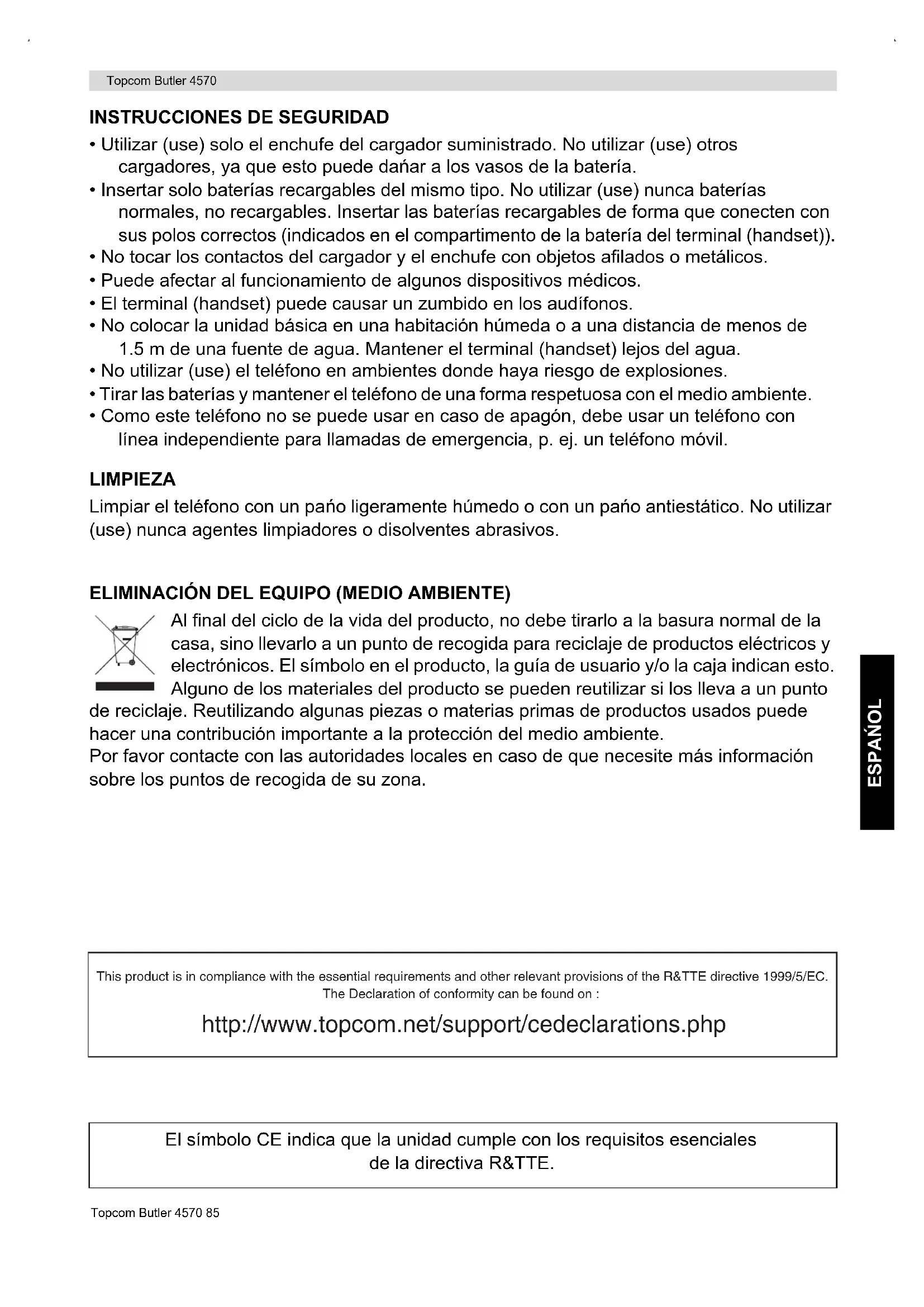 - Como este teléfono no se puede usar en caso de apagón, debe usar un teléfono con línea independiente para llamadas de emergencia, p. ej. un teléfono móvil. LIMPIEZA Limpiar el teléfono con un paĔo ligeramente húmedo o con un paĔo antiestático. No utilizar (use) nunca agentes limpiadores o disolventes abrasivos. ELIMINACIÓN DEL EQUIPO (MEDIO AMBIENTE) Al final del ciclo de la vida del producto, no debe tirarlo a la basura normal de la casa, sino llevarlo a un punto de recogida para reciclaje de productos eléctricos y electrónicos. El símbolo en el producto, la guía de usuario y/o la caja indican esto. Alguno de los materiales del producto se pueden reutilizar si los lleva a un punto de reciclaje. Reutilizando algunas piezas o materias primas de productos usados puede hacer una contribución importante a la protección del medio ambiente. Por favor contacte con las autoridades locales en caso de que necesite más información sobre los puntos de recogida de su zona. El símbolo CE indica que la unidad cumple con los requisitos esenciales de la directiva R&TTE. This product is in compliance with the essential requirements and other relevant provisions of the R&TTE directive 1999/5/EC. The Declaration of conformity can be found on : http://www.topcom.net/support/cedeclarations.phpTopcom Butler 4570 86 Topcom Butler 4570 1 EMPEZANDO