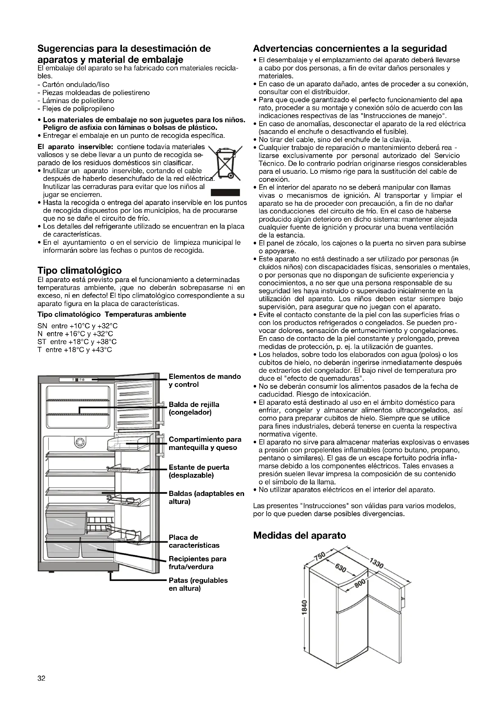 - No utilizar aparatos eléctricos en el interior del aparato. Las presentes "Instrucciones" son válidas para varios modelos, por lo que pueden darse posibles divergencias. Medidas del aparato Elementos de mando y control Tipo climatológico El aparato está previsto para el funcionamiento a determinadas temperaturas ambiente, ¡que no deberán sobrepasarse ni en exceso, ni en defecto! El tipo climatológico correspondiente a su aparato figura en la placa de características. Tipo climatológico Temperaturas ambiente SN entre +10°C y +32°C N entre +16°C y +32°C ST entre +18°C y +38°C T entre +18°C y +43°C Sugerencias para la desestimación de aparatos y material de embalaje El embalaje del aparato se ha fabricado con materiales recicla- bles. - Cartón ondulado/liso - Piezas moldeadas de poliestireno - Láminas de polietileno - Flejes de polipropileno