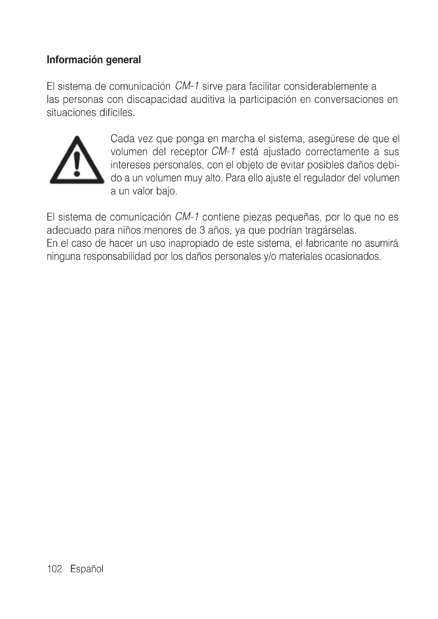 Cada vez que ponga en marcha el sistema, asegúrese de que el volumen del receptor CM-1 está ajustado correctamente a sus intereses personales, con el的对象o de evaporar posibles daños debido a un volumen muy alto. Paraarlo ajuste el regulator del volumen a un valor bajo.