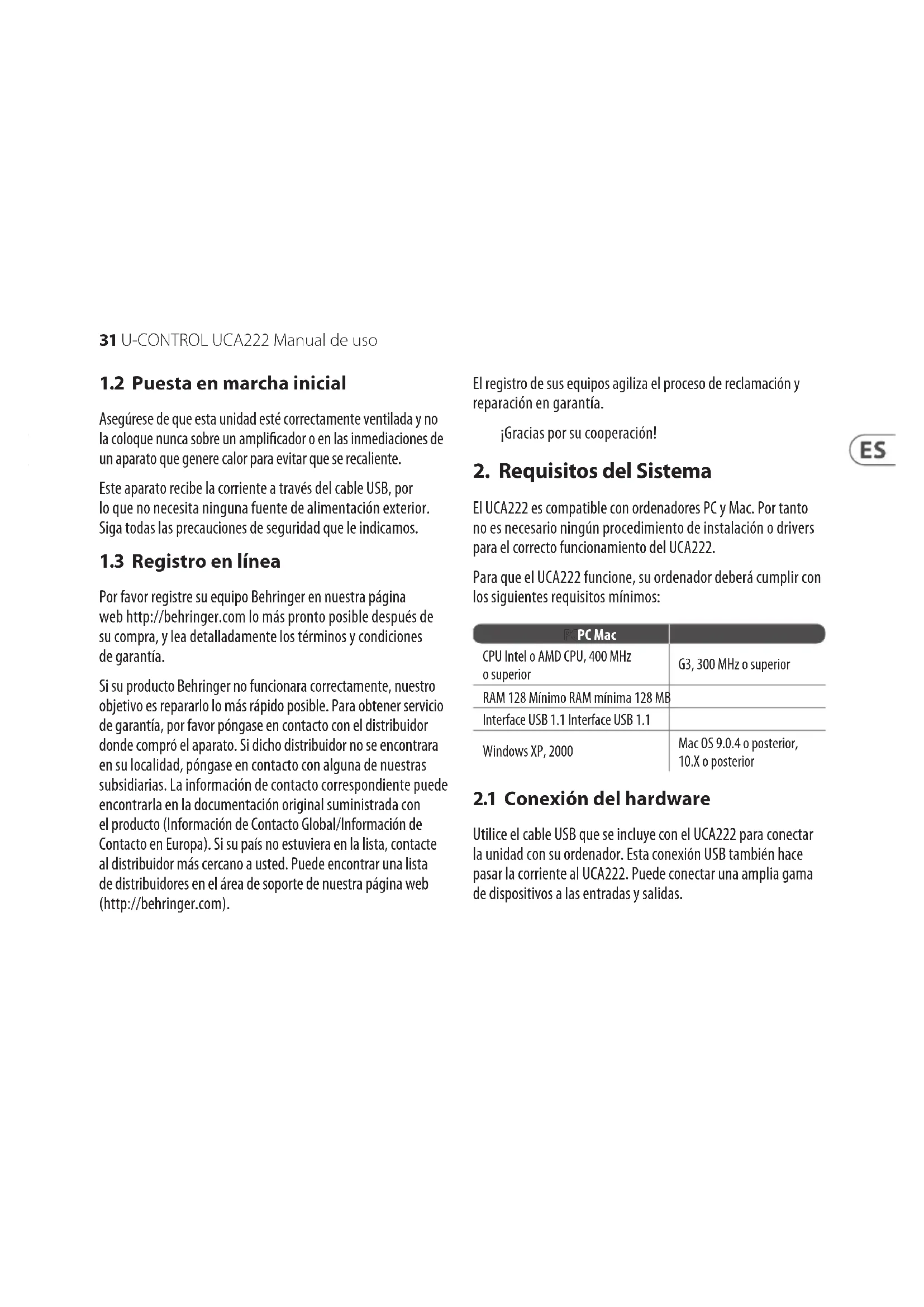 Utilice el cable USB que se incluye con el UCA222 para conectar la unidad con su ordenador. Esta conexión USB también hace pasar la corriente al UCA222. Puedeconectar una amplia gama de dispositivos a las entradas y salidas. PCPC Mac CPU Intel o AMD CPU, 400 MHz osuperior G3, 300 MHz o superior RAM 128 Mínimo RAM mínima 128 MB Interface USB 1.1 Interface USB 1.1 Windows XP, 2000 Mac OS 9.0.4 o posterior, 10.Xo posterior32 U-CONTROL UCA222 Manual de uso