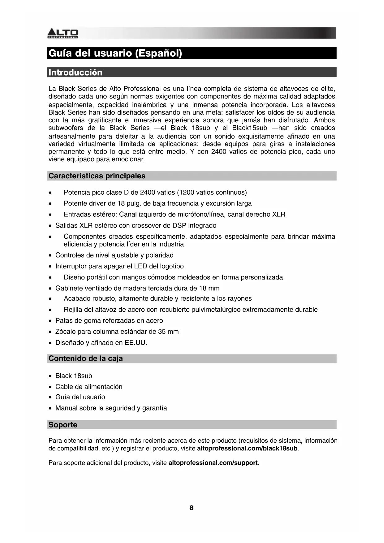 - Manual sobre la seguridad y garantía Soporte Para obtener la información más reciente acerca de este producto (requisitos de sistema, información de compatibilidad, etc.) y registrar el producto, visite altoprofessional.com/black18sub. Para soporte adicional del producto, visite altoprofessional.com/support.9
