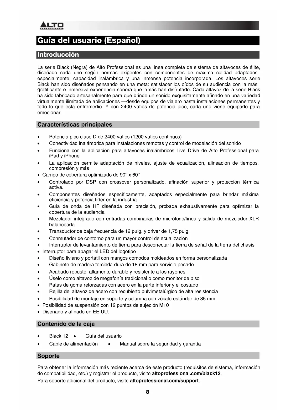 - Cable de alimentación • Manual sobre la seguridad y garantía Soporte Para obtener la información más reciente acerca de este producto (requisitos de sistema, información de compatibilidad, etc.) y registrar el producto, visite altoprofessional.com/black12. Para soporte adicional del producto, visite altoprofessional.com/support.9