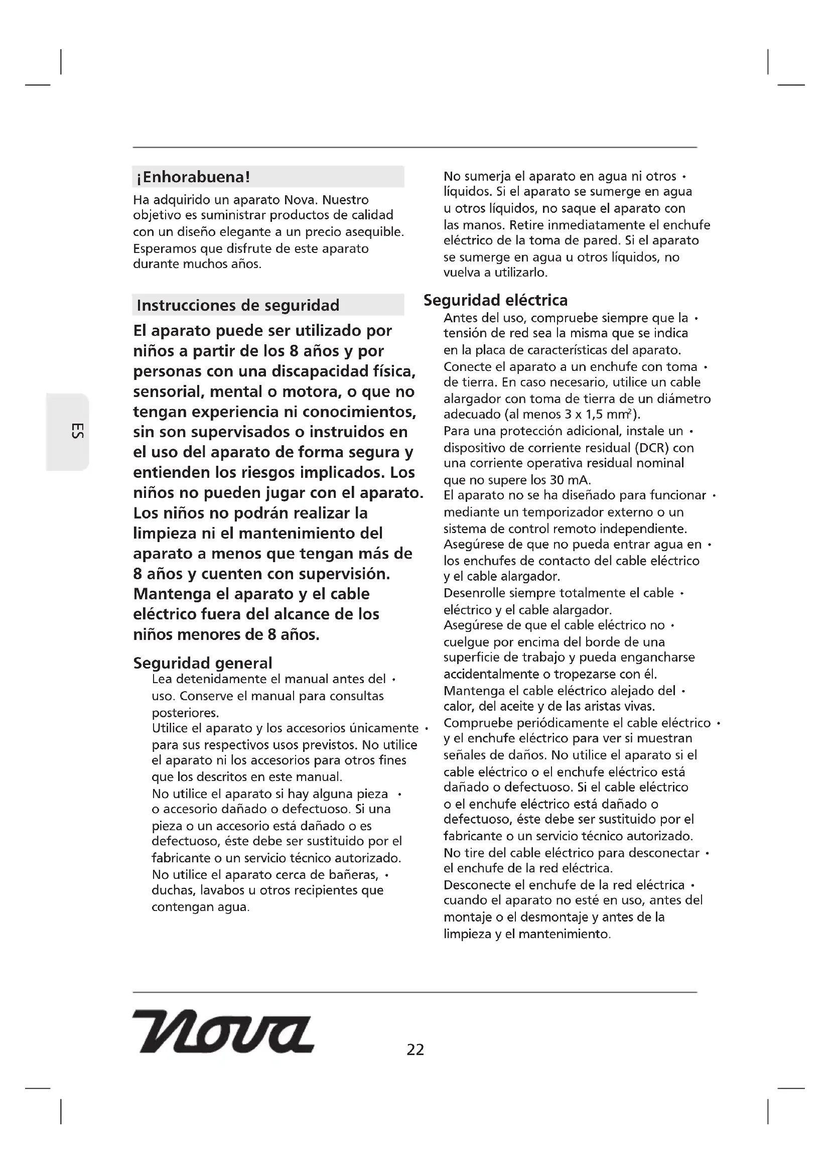 ¡Enhorabuena! Ha adquirido un aparato Nova. Nuestro objetivo es suministrar productos de calidad con un diseño elegante a un precio asequible. Esperamos que disfrute de este aparato durante muchos años. Instrucciones de seguridad El aparato puede ser utilizado por niños a partir de los 8 años y por personas con una discapacidad física, sensorial, mental o motora, o que no tengan experiencia ni conocimientos, sin son supervisados o instruidos en el uso del aparato de forma segura y entienden los riesgos implicados. Los niños no pueden jugar con el aparato. Los niños no podrán realizar la limpieza ni el mantenimiento del aparato a menos que tengan más de 8 años y cuenten con supervisión. Mantenga el aparato y el cable eléctrico fuera del alcance de los niños menores de 8 años. Seguridad general Lea detenidamente el manual antes del • uso. Conserve el manual para consultas posteriores. Utilice el aparato y los accesorios únicamente • para sus respectivos usos previstos. No utilice el aparato ni los accesorios para otros fines que los descritos en este manual. No utilice el aparato si hay alguna pieza • o accesorio dañado o defectuoso. Si una pieza o un accesorio está dañado o es defectuoso, éste debe ser sustituido por el fabricante o un servicio técnico autorizado. No utilice el aparato cerca de bañeras, • duchas, lavabos u otros recipientes que contengan agua. No sumerja el aparato en agua ni otros • líquidos. Si el aparato se sumerge en agua u otros líquidos, no saque el aparato con las manos. Retire inmediatamente el enchufe eléctrico de la toma de pared. Si el aparato se sumerge en agua u otros líquidos, no vuelva a utilizarlo. Seguridad eléctrica Antes del uso, compruebe siempre que la • tensión de red sea la misma que se indica en la placa de características del aparato. Conecte el aparato a un enchufe con toma • de tierra. En caso necesario, utilice un cable alargador con toma de tierra de un diámetro adecuado (al menos 3 x 1,5 mm