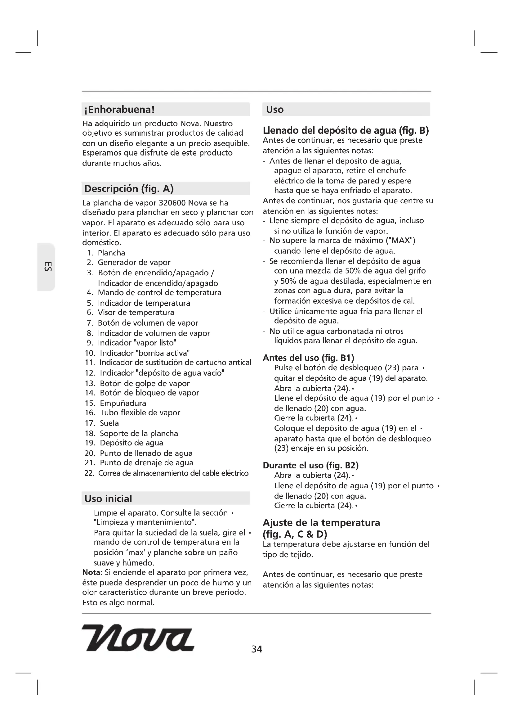 ¡Enhorabuena! Ha adquirido un producto Nova. Nuestro objetivo es suministrar productos de calidad con un diseño elegante a un precio asequible. Esperamos que disfrute de este producto durante muchos años. Descripción (fig. A) La plancha de vapor 320600 Nova se ha diseñado para planchar en seco y planchar con vapor. El aparato es adecuado sólo para uso interior. El aparato es adecuado sólo para uso doméstico.