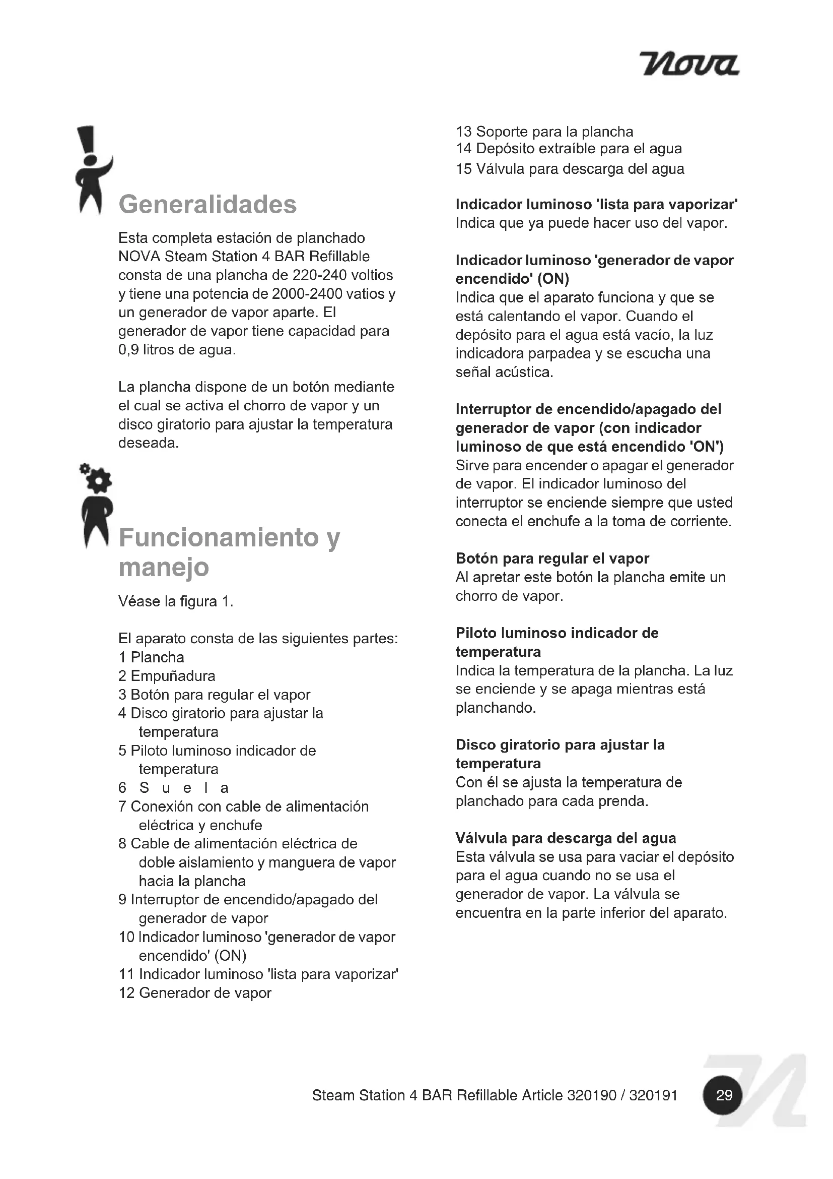 - 2002/96/EC29 Steam Station 4 BAR Refillable Article 320190 / 320191 Generalidades Esta completa estación de planchado NOVA Steam Station 4 BAR Refillable consta de una plancha de 220-240 voltios y tiene una potencia de 2000-2400 vatios y un generador de vapor aparte. El generador de vapor tiene capacidad para 0,9 litros de agua. La plancha dispone de un botón mediante el cual se activa el chorro de vapor y un disco giratorio para ajustar la temperatura deseada. Funcionamiento y manejo Véase la figura 1. El aparato consta de las siguientes partes: 1 Plancha 2 Empuñadura 3 Botón para regular el vapor 4 Disco giratorio para ajustar la temperatura 5 Piloto luminoso indicador de temperatura 6Suela 7 Conexión con cable de alimentación eléctrica y enchufe 8 Cable de alimentación eléctrica de doble aislamiento y manguera de vapor hacia la plancha 9 Interruptor de encendido/apagado del generador de vapor 10 Indicador luminoso 'generador de vapor encendido' (ON) 11 Indicador luminoso 'lista para vaporizar' 12 Generador de vapor 13 Soporte para la plancha 14 Depósito extraíble para el agua 15 Válvula para descarga del agua Indicador luminoso 'lista para vaporizar' Indica que ya puede hacer uso del vapor. Indicador luminoso 'generador de vapor encendido' (ON) Indica que el aparato funciona y que se está calentando el vapor. Cuando el depósito para el agua está vacío, la luz indicadora parpadea y se escucha una señal acústica. Interruptor de encendido/apagado del generador de vapor (con indicador luminoso de que está encendido 'ON') Sirve para encender o apagar el generador de vapor. El indicador luminoso del interruptor se enciende siempre que usted conecta el enchufe a la toma de corriente. Botón para regular el vapor Al apretar este botón la plancha emite un chorro de vapor. Piloto luminoso indicador de temperatura Indica la temperatura de la plancha. La luz se enciende y se apaga mientras está planchando. Disco giratorio para ajustar la temperatura Con él se ajusta la temperatura de planchado para cada prenda. Válvula para descarga del agua Esta válvula se usa para vaciar el depósito para el agua cuando no se usa el generador de vapor. La válvula se encuentra en la parte inferior del aparato.30 Steam Station 4 BAR Refillable Article 320190 / 320191 Antes del primer uso