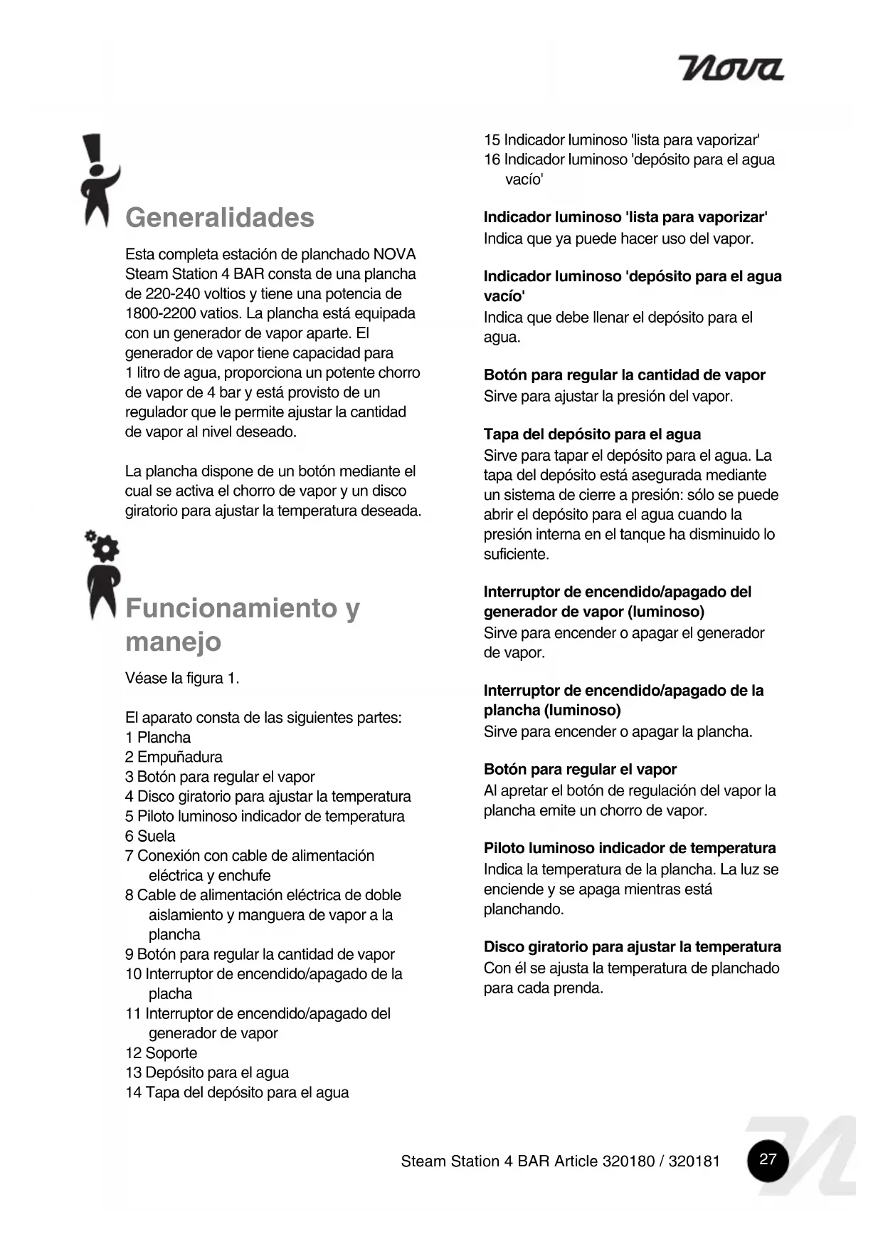 - 2002/96/EC27 Steam Station 4 BAR Article 320180 / 320181 Generalidades Esta completa estación de planchado NOVA Steam Station 4 BAR consta de una plancha de 220-240 voltios y tiene una potencia de 1800-2200 vatios. La plancha está equipada con un generador de vapor aparte. El generador de vapor tiene capacidad para 1 litro de agua, proporciona un potente chorro de vapor de 4 bar y está provisto de un regulador que le permite ajustar la cantidad de vapor al nivel deseado. La plancha dispone de un botón mediante el cual se activa el chorro de vapor y un disco giratorio para ajustar la temperatura deseada. Funcionamiento y manejo Véase la figura 1. El aparato consta de las siguientes partes: 1 Plancha 2 Empuñadura 3 Botón para regular el vapor 4 Disco giratorio para ajustar la temperatura 5 Piloto luminoso indicador de temperatura 6 Suela 7 Conexión con cable de alimentación eléctrica y enchufe 8 Cable de alimentación eléctrica de doble aislamiento y manguera de vapor a la plancha 9 Botón para regular la cantidad de vapor 10 Interruptor de encendido/apagado de la placha 11 Interruptor de encendido/apagado del generador de vapor 12 Soporte 13 Depósito para el agua 14 Tapa del depósito para el agua 15 Indicador luminoso 'lista para vaporizar' 16 Indicador luminoso 'depósito para el agua vacío' Indicador luminoso 'lista para vaporizar' Indica que ya puede hacer uso del vapor. Indicador luminoso 'depósito para el agua vacío' Indica que debe llenar el depósito para el agua. Botón para regular la cantidad de vapor Sirve para ajustar la presión del vapor. Tapa del depósito para el agua Sirve para tapar el depósito para el agua. La tapa del depósito está asegurada mediante un sistema de cierre a presión: sólo se puede abrir el depósito para el agua cuando la presión interna en el tanque ha disminuido lo suficiente. Interruptor de encendido/apagado del generador de vapor (luminoso) Sirve para encender o apagar el generador de vapor. Interruptor de encendido/apagado de la plancha (luminoso) Sirve para encender o apagar la plancha. Botón para regular el vapor Al apretar el botón de regulación del vapor la plancha emite un chorro de vapor. Piloto luminoso indicador de temperatura Indica la temperatura de la plancha. La luz se enciende y se apaga mientras está planchando. Disco giratorio para ajustar la temperatura Con él se ajusta la temperatura de planchado para cada prenda.28 Steam Station 4 BAR Article 320180 / 320181 Antes del primer uso