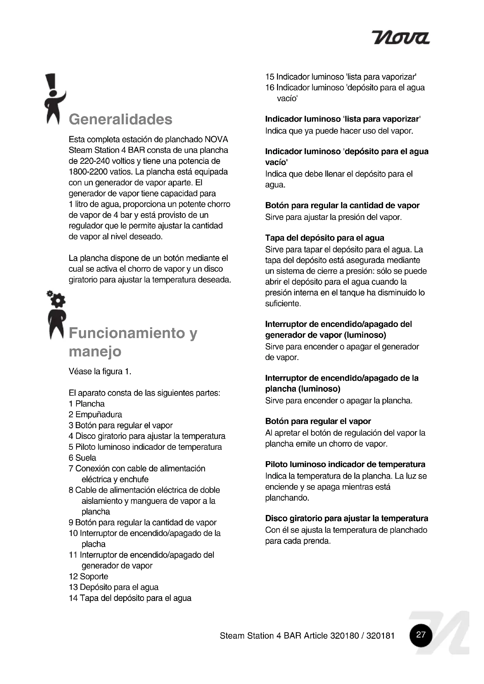 - 2002/96/EC27 Steam Station 4 BAR Article 320180 / 320181 Generalidades Esta completa estación de planchado NOVA Steam Station 4 BAR consta de una plancha de 220-240 voltios y tiene una potencia de 1800-2200 vatios. La plancha está equipada con un generador de vapor aparte. El generador de vapor tiene capacidad para 1 litro de agua, proporciona un potente chorro de vapor de 4 bar y está provisto de un regulador que le permite ajustar la cantidad de vapor al nivel deseado. La plancha dispone de un botón mediante el cual se activa el chorro de vapor y un disco giratorio para ajustar la temperatura deseada. Funcionamiento y manejo Véase la figura 1. El aparato consta de las siguientes partes: 1 Plancha 2 Empuñadura 3 Botón para regular el vapor 4 Disco giratorio para ajustar la temperatura 5 Piloto luminoso indicador de temperatura 6 Suela 7 Conexión con cable de alimentación eléctrica y enchufe 8 Cable de alimentación eléctrica de doble aislamiento y manguera de vapor a la plancha 9 Botón para regular la cantidad de vapor 10 Interruptor de encendido/apagado de la placha 11 Interruptor de encendido/apagado del generador de vapor 12 Soporte 13 Depósito para el agua 14 Tapa del depósito para el agua 15 Indicador luminoso 'lista para vaporizar' 16 Indicador luminoso 'depósito para el agua vacío' Indicador luminoso 'lista para vaporizar' Indica que ya puede hacer uso del vapor. Indicador luminoso 'depósito para el agua vacío' Indica que debe llenar el depósito para el agua. Botón para regular la cantidad de vapor Sirve para ajustar la presión del vapor. Tapa del depósito para el agua Sirve para tapar el depósito para el agua. La tapa del depósito está asegurada mediante un sistema de cierre a presión: sólo se puede abrir el depósito para el agua cuando la presión interna en el tanque ha disminuido lo suficiente. Interruptor de encendido/apagado del generador de vapor (luminoso) Sirve para encender o apagar el generador de vapor. Interruptor de encendido/apagado de la plancha (luminoso) Sirve para encender o apagar la plancha. Botón para regular el vapor Al apretar el botón de regulación del vapor la plancha emite un chorro de vapor. Piloto luminoso indicador de temperatura Indica la temperatura de la plancha. La luz se enciende y se apaga mientras está planchando. Disco giratorio para ajustar la temperatura Con él se ajusta la temperatura de planchado para cada prenda.28 Steam Station 4 BAR Article 320180 / 320181 Antes del primer uso