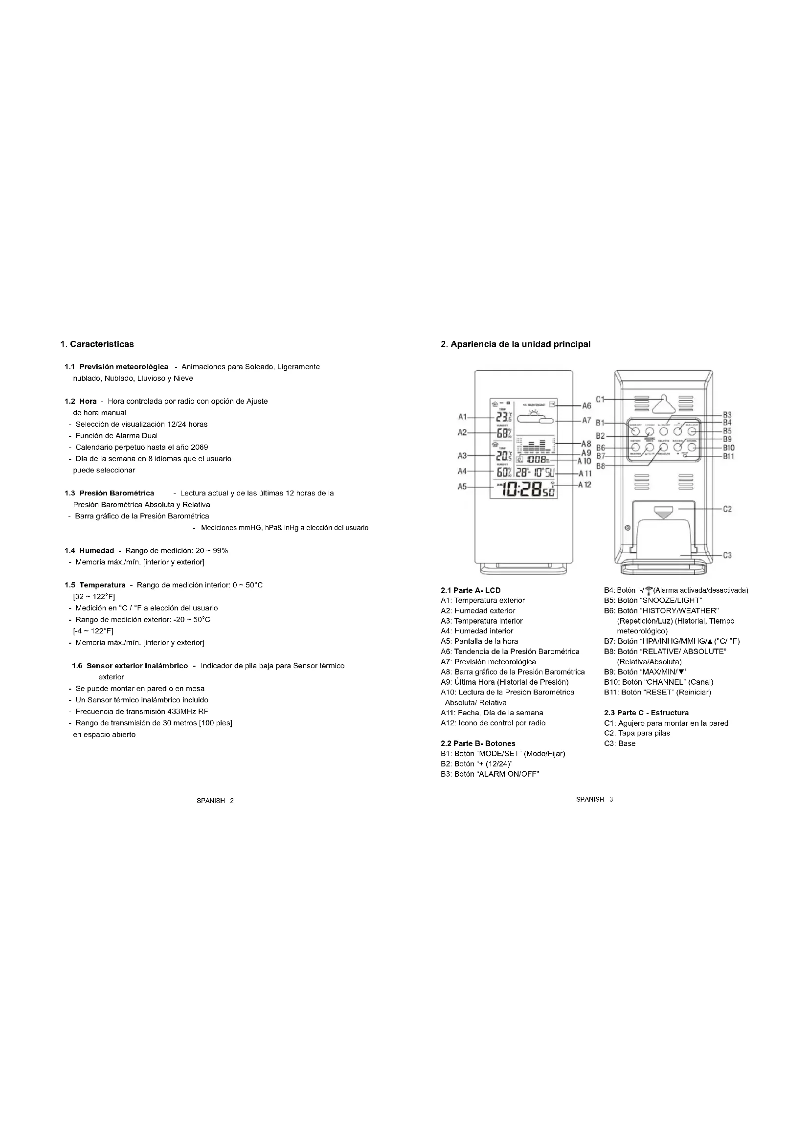 Pulse el botón “+(12/24)” (B2) para seleccionar el modo 12 ó 24 horas. (A12)parpadea, Indica que está recibiendo la señal DCF (A12) se enciende, Indica que la señal se ha recibido con éxito (A12) desaparece, Indica que la recepción de la señal ha fallado Idioma Domingo Lunes Martes Miércoles Jueves Viernes Sábado Alemán, GE SO MO DI MI DO FR SA Inglés, EN SU MO TU WE TH FR SA Ruso, RU BC BT CP Danés, DA SO MA TI ON TO FR LO Neerlandés, NE ZO MA DI WO DO VR ZA Italiano, IT DO LU MA ME GI VE SA Español, ES DO LU MA MI JU VI SA Francés, FR DI LU MA ME JE VE SAAL808 SPANISH 10 Datos interiores: Rango de temperatura: 0 a 50°C [32 a 122°F] Unidades de Temperatura medidas: °C o °F [seleccionable] Rango de humedad: 20% a 99% Rango de Presión del Aire: Unidades de Presión del Aire medidas: mb/hPa, inHg & mmHG [seleccionable] Previsión Meteorológica: 5 iconos [soleado, ligeramente nublado, nublado, lluvia y nieve] Datos exteriores: Distancia de transmisión: (espacio abierto 30m a 433MHz Rango de temperatura: -20°C a 50°C [-4 a 122°F] pared / mesa Dimensiones de la unidad principal: 80 x 158 x 19 mm Dimensiones del sensor térmico: 65 x 84 x 18 mm Requisitos de las pilas: Estación base [interior]: 3 pilas AAA Sensores [exterior]: 2 pilas AAA