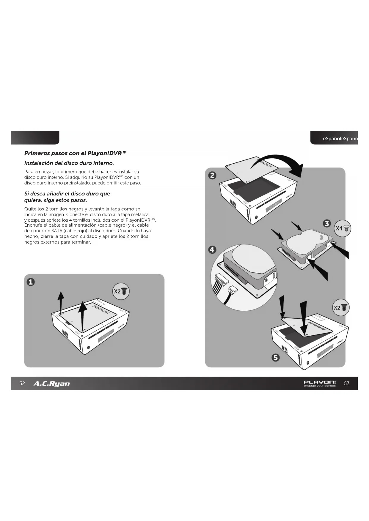 Nota: cuando inserte un disco duro con datos, al darle formato se perderán todos los datos. Asegúrese de hacer primero una copia de seguridad de los datos antes de dar formato al disco duro dentro del reproductor. Copie sus archivos de la copia de seguridad después del formato en el disco duro del reproductor.Tómese su tiempo para explorar el menú de configuración y personalice los parámetros que desee utilizar. Entonces estará preparado para usar su Playon!DVR . Playon! Engage your senses.
