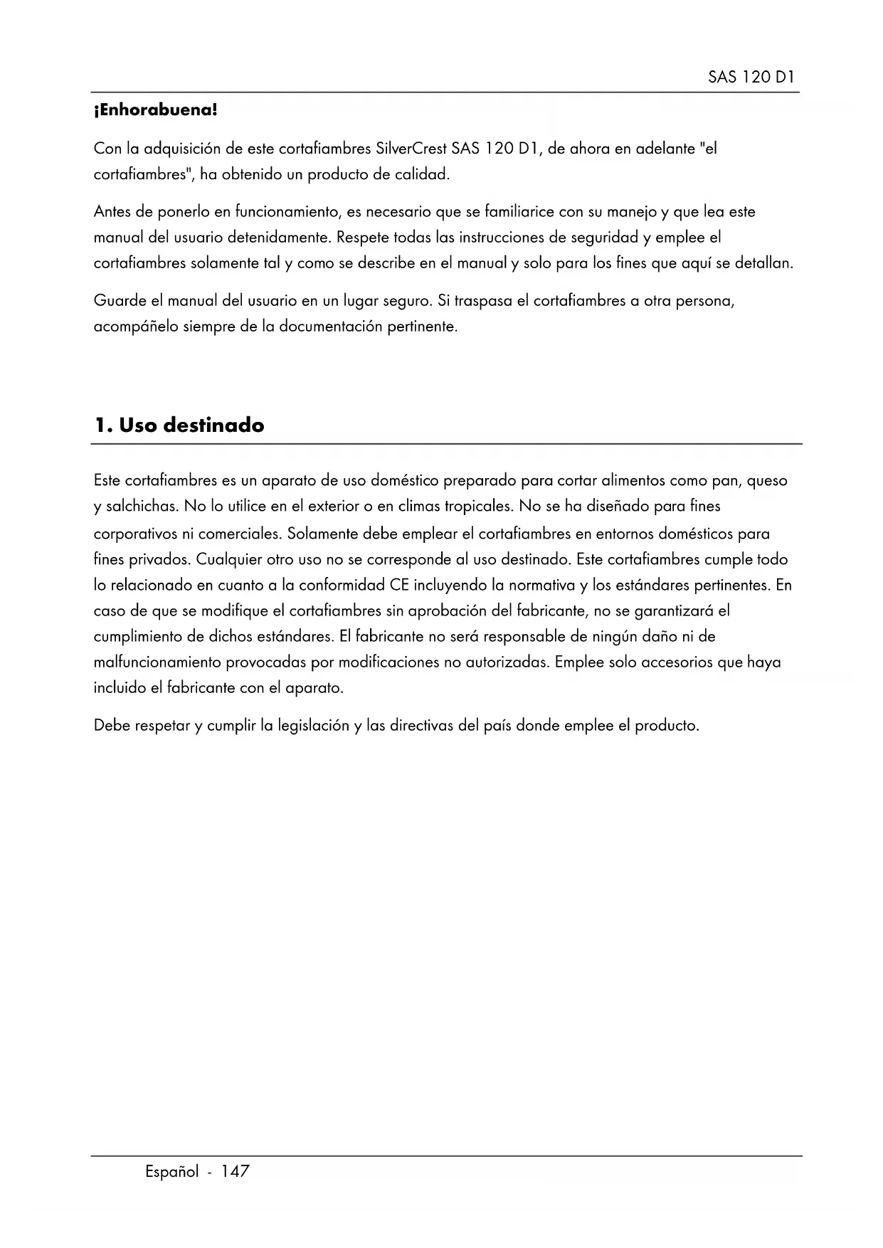 Este cortafiambres es un aparato de uso doméstico preparado para cortar alimentos como pan, queso y salchichas. No lo utilice en el exterior o en climas tropicales. No se ha diseñado para fines corporativos ni comerciales. Solamente debe emplear el cortafiambres en entornos domésticos para fines privados. Cualquier otro uso no se corresponde al uso destinado. Este cortafiambres cumple todo lo relacionado en cuanto a la conformidad CE incluyendo la normativa y los estándares pertinentes. En caso de que se modifique el cortafiambres sin aprobación del fabricante, no se garantizará el cumplimiento de dichos estándares. El fabricante no será responsable de ningún daño ni de malfuncionamiento provocadas por modificaciones no autorizadas. Emplee solo accesorios que haya incluido el fabricante con el aparato. Debe respetar y cumplir la legislación y las directivas del país donde emplee el producto.SAS 120 D1