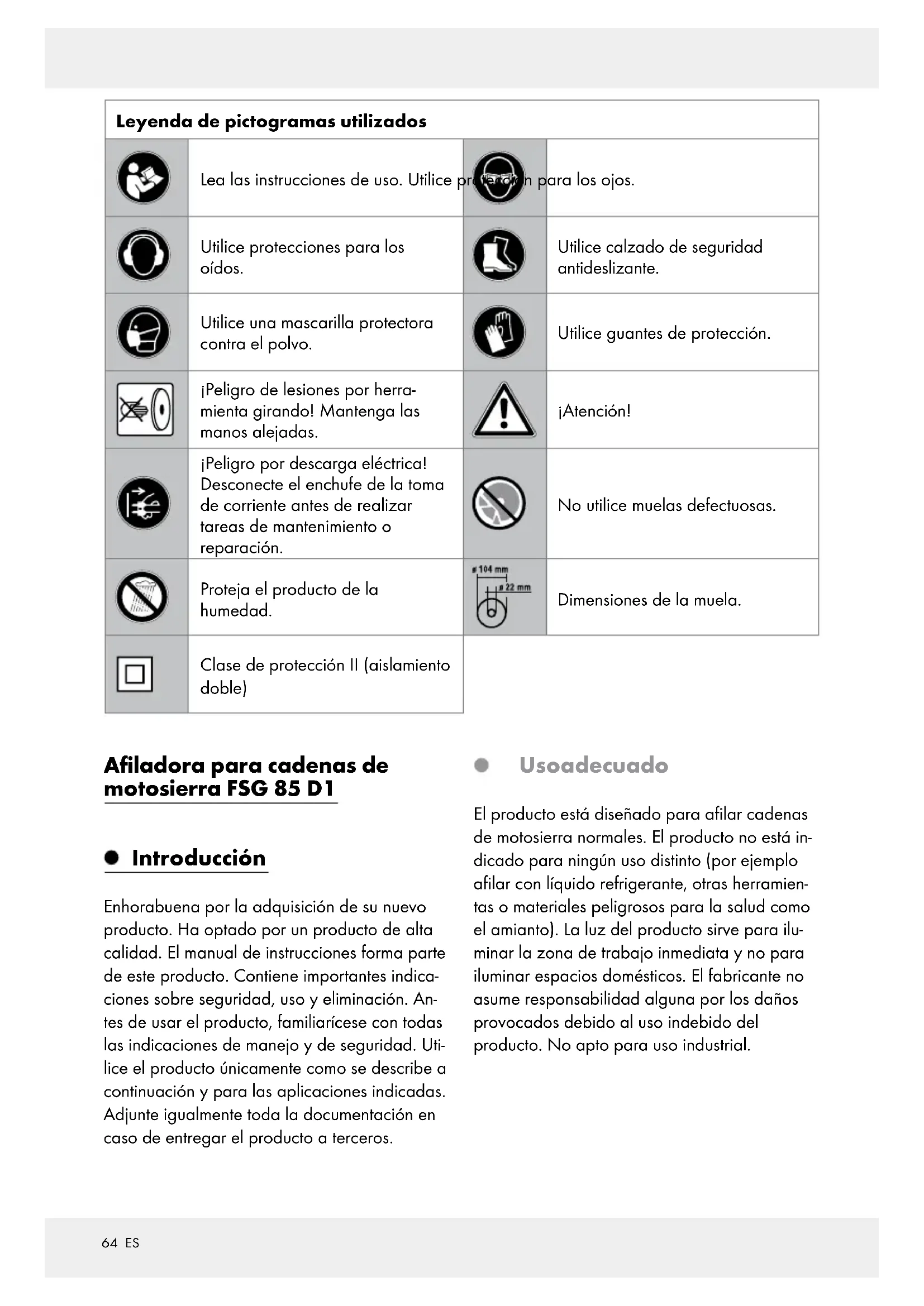 repare su herramienta eléctrica Esta herramienta eléctrica cumple con las normas de seguridad pertinentes. Las reparaciones solo deberán ser realizadas por un electricista que utilice piezas de repuesto originales. Lo contrario podría provocar accidentes para el usuario. Los siguientes riesgos residuales continuarán existiendo a pesar de las medidas, el diseño especialmente seguro y las medidas de68 ES sobrecarga y protección medidas: la muela sigue rotando una vez apagada la herrami- enta. Existe riesgo de sufrir lesiones. Otras indicaciones de seguridad Conecte el producto exclusivamente a una toma de corriente con dispositivo diferen- cial (interruptor diferencial) que tenga una corriente diferencial asignada de no más de 30 mA. Mantenga los cables de red y de los alar- gadores alejados de la muela y de la cadena. Desconecte el enchufe de la toma de corriente si daña o corta algún cable. No toque el cable hasta que no lo haya desenchufado de la corriente. ¡Peligro por descarga eléctrica! Realice un examen visual de la muela antes de utilizarla. No utilice ninguna muela que presente desconchaduras, grietas u otros daños. Sustituya las muelas desgastadas. Nunca utilice el producto sin la pantalla protectora. No trabaje con el producto si está cansado o después de haber ingerido alcohol o medicamentos. Realice siempre pausas mientras trabaja. No utilice el producto en entornos poten- cialmente explosivos o donde puedan originarse chispas, fuegos, explosiones, etc. De lo contrario existe riesgo de incendio o explosión. Cuando realice trabajos que desprendan polvo, asegúrese de que las ranuras de ventilación estén libres. Mantenga las manos alejadas de la muela y de los dientes de la cadena mientras el producto esté en funcionamiento. No mueva la cadena de motosierra con las manos. Existe riesgo de sufrir lesiones. Nunca ponga los dedos entre la muela y el plato giratorio o entre la muela y la pantalla protectora. Existe peligro por aplastamiento. La cadena se calienta al afilarla. Nunca toque la zona tratada ya que existe riesgo de sufrir quemaduras. Utilice solo muelas recomendadas por el fabricante. No utilice hojas de sierra. Apague el producto y saque el enchufe de la toma de corriente - para liberar una pieza que haya quedado bloqueada; - si el cable de alimentación está dañado o enredado; - si escucha ruidos extraños. Antes de la puesta en marcha Nota: Retire completamente el material de embalaje. La persona que maneje el producto debe colocarse cerca de este para evitar un estiramiento innecesario del cuerpo y una postura inestable. Montaje Nota: Fije siempre el producto con los tornillos suministrados (M10 x 60). Compruebe que tenga espacio suficiente para trabajar y que no ponga en peligro a terceras personas. Fije el producto siempre utilizando tornillos suficientemente largos y fuertes a la superfi- cie de trabajo para no perder el control del producto.69 ES Colocar el producto (véase fig. B) - Grosor del canto de la mesa empleada: 15–30 mm - Diámetro del orificio: 10,5 mm - Tamaño del tornillo: M10 Coloque el producto con ayuda de las muescas tope