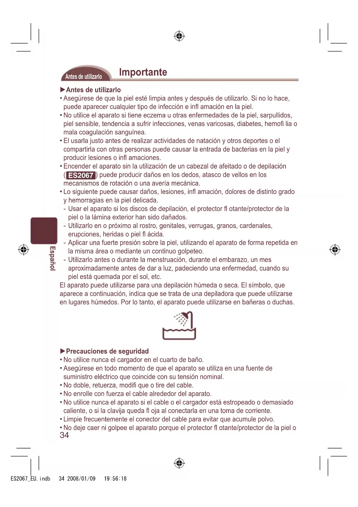 Supporto Accessori: Caricabatteria (RE7-46), spazzola per la pulizia e custodia (Non utilizzare accessori diversi da quelli in dotazione.) ES2067_EU.indb 33 2008/01/09 19:56:1734 Español Importante Antes de utilizarlo Antes de utilizarlo Asegúrese de que la piel esté limpia antes y después de utilizarlo. Si no lo hace, puede aparecer cualquier tipo de infección e infl amación en la piel. No utilice el aparato si tiene eczema u otras enfermedades de la piel, sarpullidos, piel sensible, tendencia a sufrir infecciones, venas varicosas, diabetes, hemofi lia o mala coagulación sanguínea. El usarla justo antes de realizar actividades de natación y otros deportes o el compartirla con otras personas puede causar la entrada de bacterias en la piel y producir lesiones o infl amaciones. Encender el aparato sin la utilización de un cabezal de afeitado o de depilación