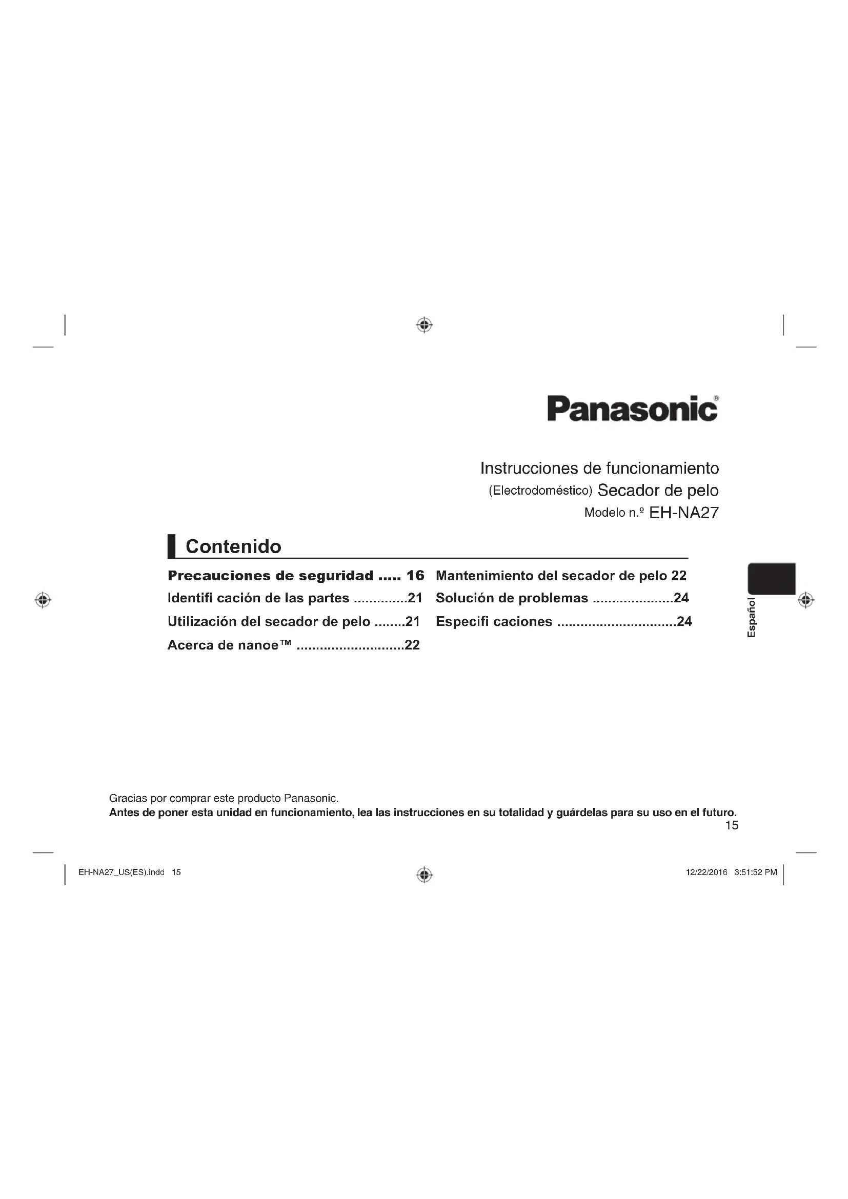 - 30-Day Quality Satisfaction Guarantee If you are dissatisfi ed with any Panasonic Personal Care & Beauty Care Products for any reason, simply return it to the place of purchase with a dated proof of purchase, in the original packaging, with all accessories, parts and instructions, within 30 days of the date of purchase, for a full refund, or call Panasonic at 1-800-338-0552. Abuse or misapplication of this product voids the guarantee. EH-NA27_US.indb 14EH-NA27_US.indb 14 11/24/2016 9:52:26 AM11/24/2016 9:52:26 AM15 Español Instrucciones de funcionamiento (Electrodoméstico) Secador de pelo Modelo n.º EH-NA27 Gracias por comprar este producto Panasonic. Antes de poner esta unidad en funcionamiento, lea las instrucciones en su totalidad y guárdelas para su uso en el futuro. Precauciones de seguridad p. 16