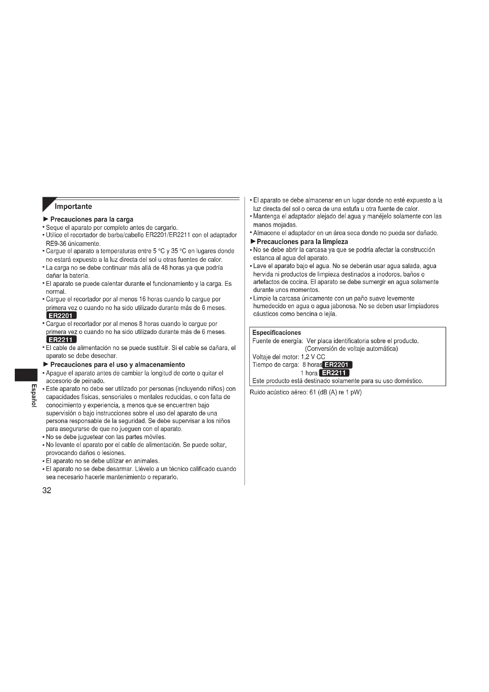 Español Importante Precauciones para la carga Seque el aparato por completo antes de cargarlo. Utilice el recortador de barba/cabello ER2201/ER2211 con el adaptador RE9‑36 únicamente. Cargue el aparato a temperaturas entre 5 °C y 35 °C en lugares donde no estará expuesto a la luz directa del sol u otras fuentes de calor. La carga no se debe continuar más allá de 48 horas ya que podría dañar la batería. El aparato se puede calentar durante el funcionamiento y la carga. Es normal. Cargue el recortador por al menos 16 horas cuando lo cargue por primera vez o cuando no ha sido utilizado durante más de 6 meses. ER2201 Cargue el recortador por al menos 8 horas cuando lo cargue por primera vez o cuando no ha sido utilizado durante más de 6 meses. ER2211 El cable de alimentación no se puede sustituir. Si el cable se dañara, el aparato se debe desechar. Precauciones para el uso y almacenamiento Apague el aparato antes de cambiar la longitud de corte o quitar el accesorio de peinado. Este aparato no debe ser utilizado por personas (incluyendo niños) con capacidades físicas, sensoriales o mentales reducidas, o con falta de conocimiento y experiencia, a menos que se encuentren bajo supervisión o bajo instrucciones sobre el uso del aparato de una persona responsable de la seguridad. Se debe supervisar a los niños para asegurarse de que no jueguen con el aparato. No se debe juguetear con las partes móviles. No levante el aparato por el cable de alimentación. Se puede soltar, provocando daños o lesiones. El aparato no se debe utilizar en animales. El aparato no se debe desarmar. Llévelo a un técnico calicado cuando sea necesario hacerle mantenimiento o repararlo.