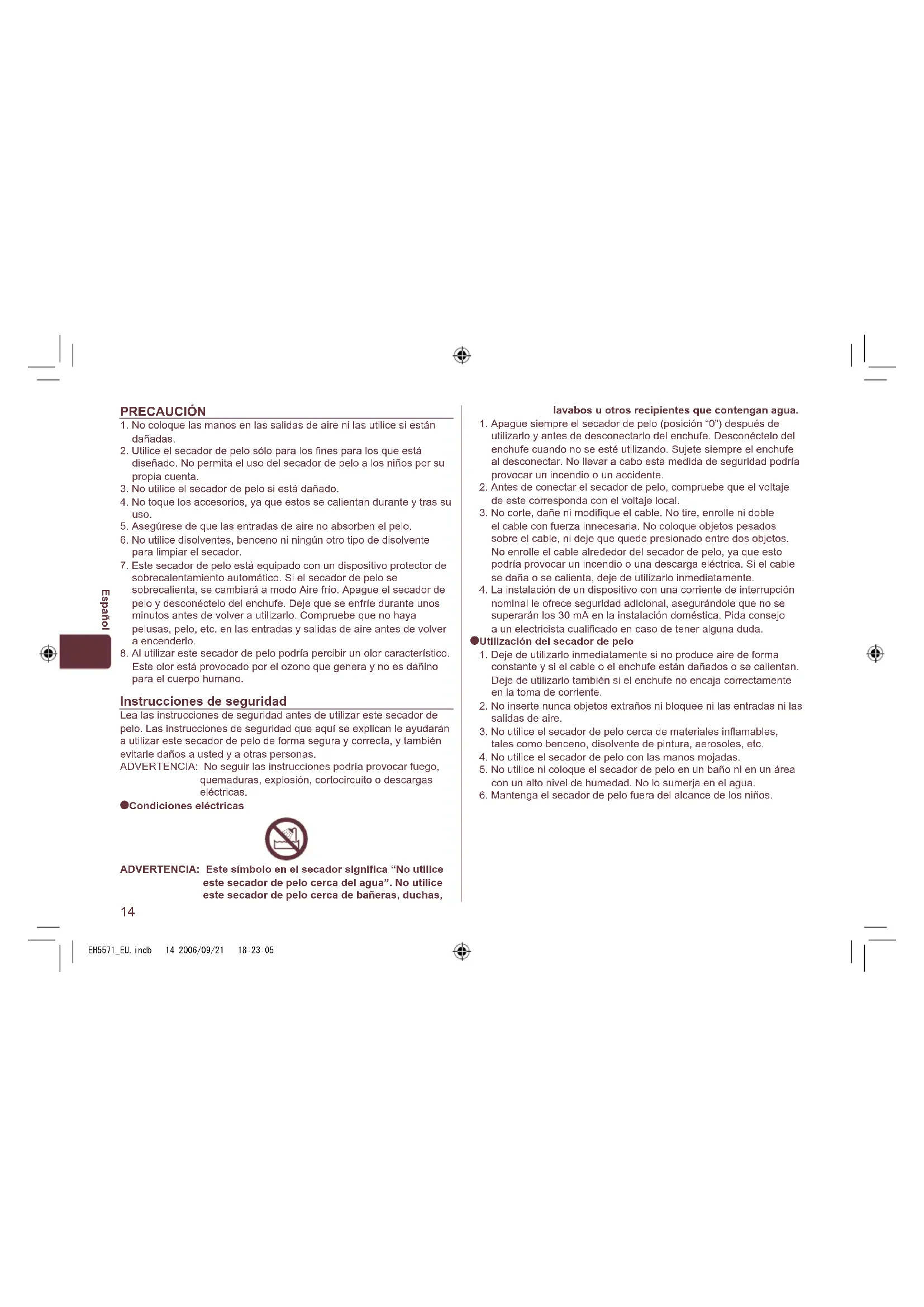 Condiciones eléctricas ADVERTENCIA: Este símbolo en el secador significa “No utilice este secador de pelo cerca del agua”. No utilice este secador de pelo cerca de bañeras, duchas, lavabos u otros recipientes que contengan agua.