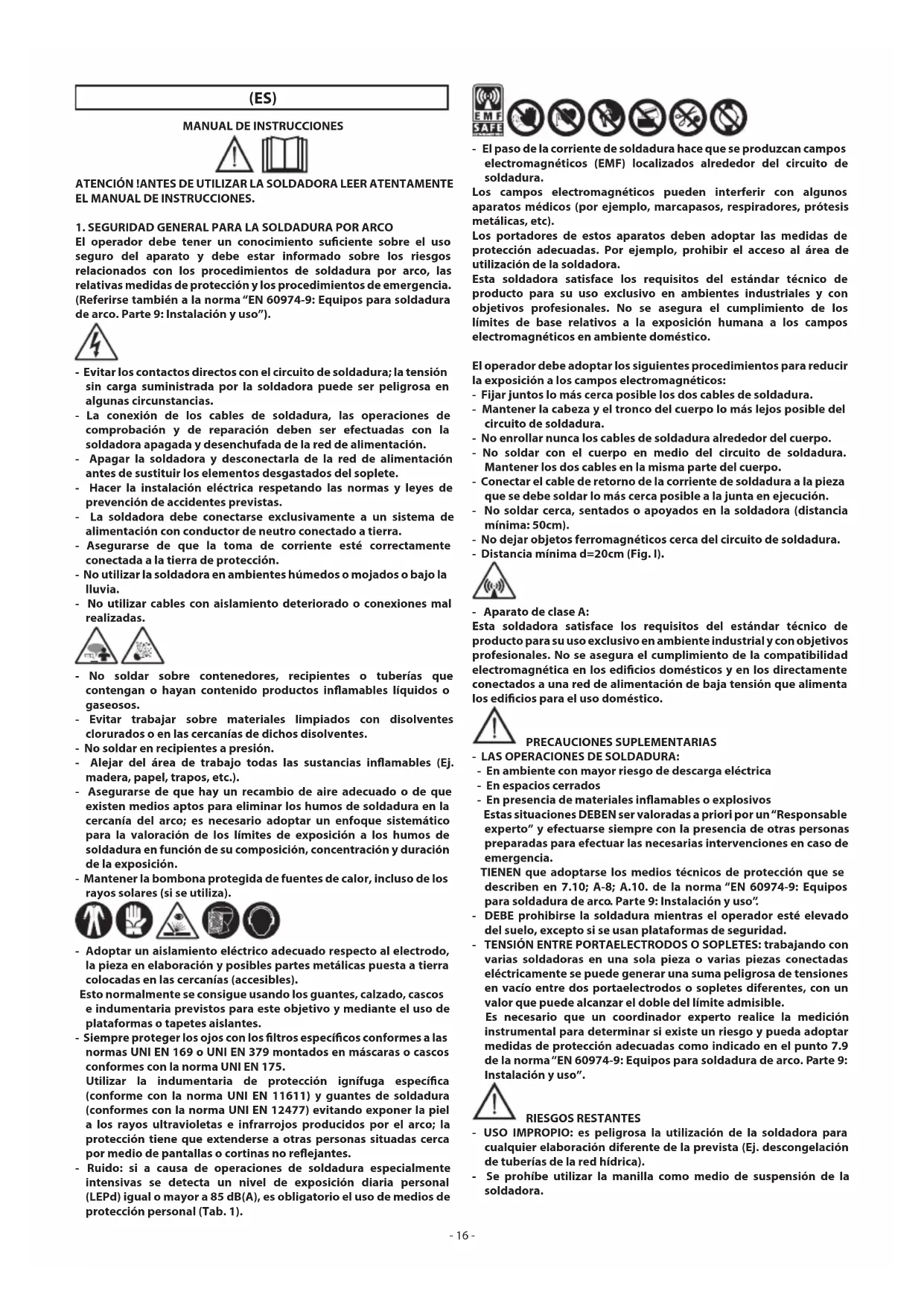 El operador debe tener un conocimiento suciente sobre el uso seguro del aparato y debe estar informado sobre los riesgos relacionados con los procedimientos de soldadura por arco, las relativas medidas de protección y los procedimientos de emergencia. (Referirse también a la norma “EN 60974-9: Equipos para soldadura de arco. Parte 9: Instalación y uso”). - Evitar los contactos directos con el circuito de soldadura; la tensión sin carga suministrada por la soldadora puede ser peligrosa en algunas circunstancias. - La conexión de los cables de soldadura, las operaciones de comprobación y de reparación deben ser efectuadas con la soldadora apagada y desenchufada de la red de alimentación. - Apagar la soldadora y desconectarla de la red de alimentación antes de sustituir los elementos desgastados del soplete. - Hacer la instalación eléctrica respetando las normas y leyes de prevención de accidentes previstas. - La soldadora debe conectarse exclusivamente a un sistema de alimentación con conductor de neutro conectado a tierra. - Asegurarse de que la toma de corriente esté correctamente conectada a la tierra de protección. - No utilizar la soldadora en ambientes húmedos o mojados o bajo la lluvia. - No utilizar cables con aislamiento deteriorado o conexiones mal realizadas. - No soldar sobre contenedores, recipientes o tuberías que contengan o hayan contenido productos inamables líquidos o gaseosos. - Evitar trabajar sobre materiales limpiados con disolventes clorurados o en las cercanías de dichos disolventes. - No soldar en recipientes a presión. - Alejar del área de trabajo todas las sustancias inamables (Ej. madera, papel, trapos, etc.). - Asegurarse de que hay un recambio de aire adecuado o de que existen medios aptos para eliminar los humos de soldadura en la cercanía del arco; es necesario adoptar un enfoque sistemático para la valoración de los límites de exposición a los humos de soldadura en función de su composición, concentración y duración de la exposición. - Mantener la bombona protegida de fuentes de calor, incluso de los rayos solares (si se utiliza). - Adoptar un aislamiento eléctrico adecuado respecto al electrodo, la pieza en elaboración y posibles partes metálicas puesta a tierra colocadas en las cercanías (accesibles). Esto normalmente se consigue usando los guantes, calzado, cascos e indumentaria previstos para este objetivo y mediante el uso de plataformas o tapetes aislantes. - Siempre proteger los ojos con los ltros especícos conformes a las normas UNI EN 169 o UNI EN 379 montados en máscaras o cascos conformes con la norma UNI EN 175. Utilizar la indumentaria de protección ignífuga especíca (conforme con la norma UNI EN 11611) y guantes de soldadura (conformes con la norma UNI EN 12477) evitando exponer la piel a los rayos ultravioletas e infrarrojos producidos por el arco; la protección tiene que extenderse a otras personas situadas cerca por medio de pantallas o cortinas no reejantes. - Ruido: si a causa de operaciones de soldadura especialmente intensivas se detecta un nivel de exposición diaria personal (LEPd) igual o mayor a 85 dB(A), es obligatorio el uso de medios de protección personal (Tab. 1). - El paso de la corriente de soldadura hace que se produzcan campos electromagnéticos (EMF) localizados alrededor del circuito de soldadura. Los campos electromagnéticos pueden interferir con algunos aparatos médicos (por ejemplo, marcapasos, respiradores, prótesis metálicas, etc). Los portadores de estos aparatos deben adoptar las medidas de protección adecuadas. Por ejemplo, prohibir el acceso al área de utilización de la soldadora. Esta soldadora satisface los requisitos del estándar técnico de producto para su uso exclusivo en ambientes industriales y con objetivos profesionales. No se asegura el cumplimiento de los límites de base relativos a la exposición humana a los campos electromagnéticos en ambiente doméstico. El operador debe adoptar los siguientes procedimientos para reducir la exposición a los campos electromagnéticos: - Fijar juntos lo más cerca posible los dos cables de soldadura. - Mantener la cabeza y el tronco del cuerpo lo más lejos posible del circuito de soldadura. - No enrollar nunca los cables de soldadura alrededor del cuerpo. - No soldar con el cuerpo en medio del circuito de soldadura. Mantener los dos cables en la misma parte del cuerpo. - Conectar el cable de retorno de la corriente de soldadura a la pieza que se debe soldar lo más cerca posible a la junta en ejecución. - No soldar cerca, sentados o apoyados en la soldadora (distancia mínima: 50cm). - No dejar objetos ferromagnéticos cerca del circuito de soldadura. - Distancia mínima d=20cm (Fig. I). - Aparato de clase A: Esta soldadora satisface los requisitos del estándar técnico de producto para su uso exclusivo en ambiente industrial y con objetivos profesionales. No se asegura el cumplimiento de la compatibilidad electromagnética en los edicios domésticos y en los directamente conectados a una red de alimentación de baja tensión que alimenta los edicios para el uso doméstico. PRECAUCIONES SUPLEMENTARIAS - LAS OPERACIONES DE SOLDADURA: - En ambiente con mayor riesgo de descarga eléctrica - En espacios cerrados - En presencia de materiales inamables o explosivos Estas situaciones DEBEN ser valoradas a priori por un “Responsable experto” y efectuarse siempre con la presencia de otras personas preparadas para efectuar las necesarias intervenciones en caso de emergencia. TIENEN que adoptarse los medios técnicos de protección que se describen en 7.10; A-8; A.10. de la norma “EN 60974-9: Equipos para soldadura de arco. Parte 9: Instalación y uso”. - DEBE prohibirse la soldadura mientras el operador esté elevado del suelo, excepto si se usan plataformas de seguridad. - TENSIÓN ENTRE PORTAELECTRODOS O SOPLETES: trabajando con varias soldadoras en una sola pieza o varias piezas conectadas eléctricamente 