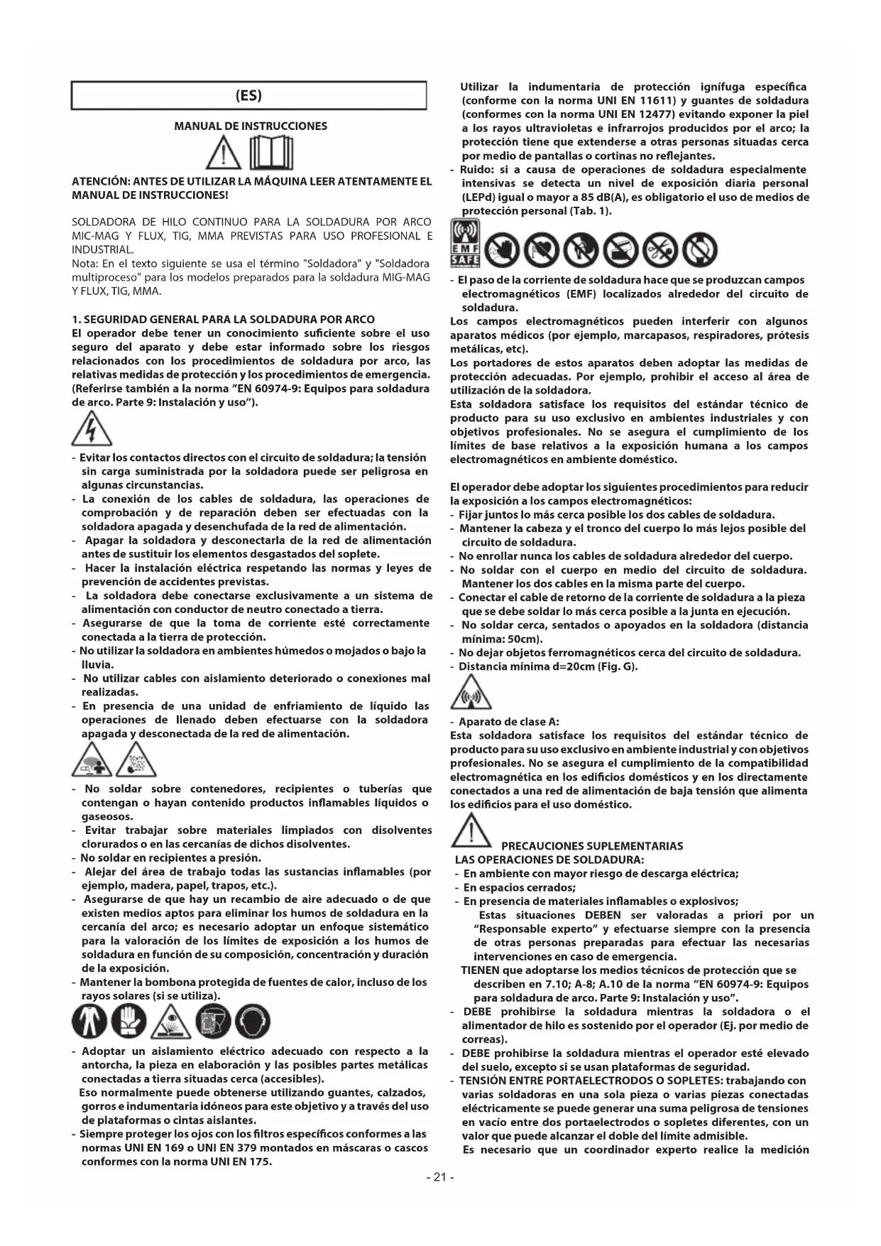 en el capítulo 1 ”Seguridad general para la soldadura por arco”. Nota: El ejemplo de chapa incluido es una indicación del signicado de los símbolos y de las cifras; los valores exactos de los datos técnicos de la soldadora en su posesión deben controlarse directamente en la chapa de la misma soldadora. OTROS DATOS TÉCNICOS: - SOLDADORA: véase tabla 1 (TAB. 1) - ANTORCHA MIG: véase tabla 2 (TAB. 2) - ANTORCHA TIG: véase tabla 3 (TAB. 3) - PINZA PORTAELECTRODO: véase tabla 4 (TAB. 4) El peso de la soldadora se indica en la tabla 1 (TAB. 1).- 23 -