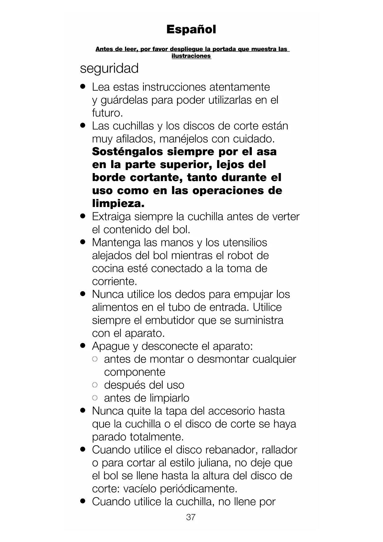 Las cuchillas y los discos de corte están muy afilados, manéjelos con cuidado. Sosténgalos siempre por el asa en la parte superior, lejos del borde cortante, tanto durante el uso como en las operaciones de limpieza.