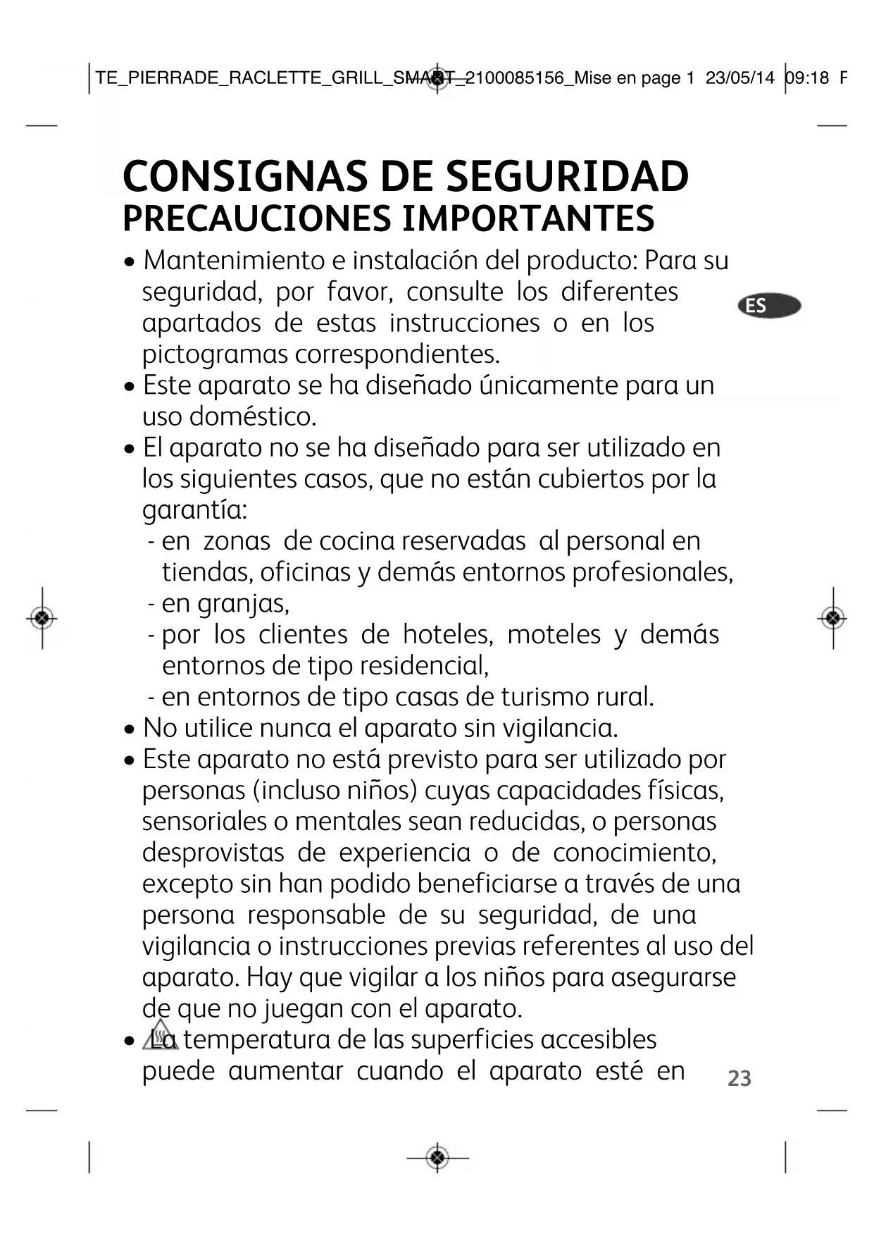 TE_PIERRADE_RACLETTE_GRILL_SMART_2100085156_Mise en page 1 23/05/14 09:18 Page24corren. Los niños no han de jugar con el aparato. La limpieza y el mantenimiento de usuario no los han de llevar a cabo niños, salvo que tengan 8 años como mínimo y estén supervisados.