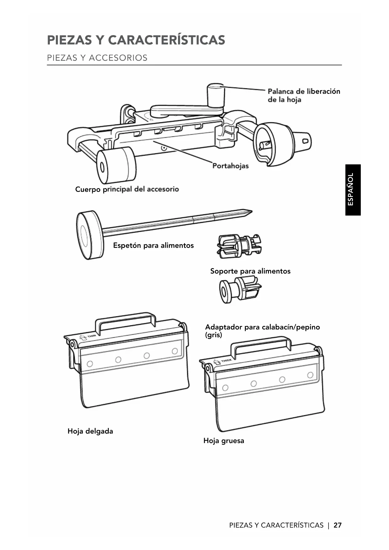 Hoja gruesa** *El grosor aproximado de la hoja será de 1,3 mm. **El grosor aproximado de la hoja será de 1,8 mm. ***El adaptador para calabacín/pepino solo se debe utilizar para alimentos blandos.30 | USO DEL ACCESORIO CORTADOR DE VERDURAS