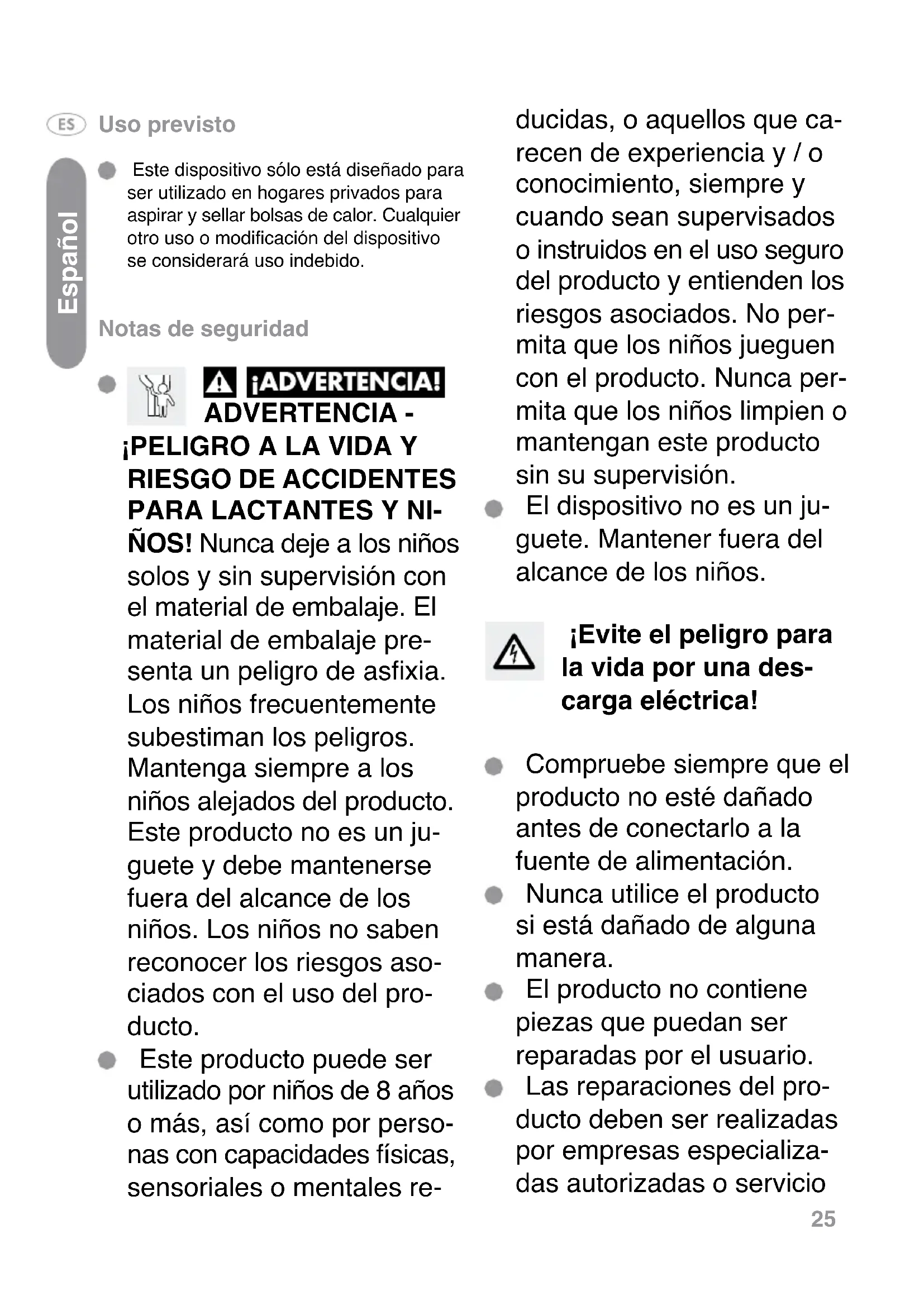 - Este dispositivosolesta Diseñado para serutilizando enhogares privadospara aspirar y sellar bolas de calor.Cualquier otherusoomodificacion deldispositivo se considerarusoindebido.