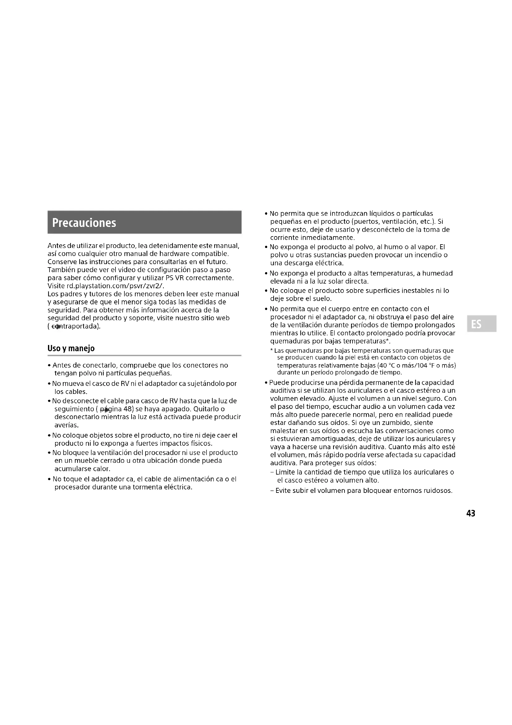 - No use un adaptador ca o un cable de alimentación ca distinto a los que se suministran con el producto. El adaptador ca y el cable de alimentación ca están diseñados exclusivamente para su uso con este producto. No se pueden utilizar con otros productos. Asimismo, no se pueden utilizar otros adaptadores ca o cables de alimentación ca con este producto. El incumplimiento de estas precauciones puede hacer que el producto se sobrecaliente, lo que podría provocar un incendio o una descarga eléctrica.masterpage:Left filename[C:\Work\PS_VR_MK3_UCS\IM\4699635111\469963511CUH-ZVR2UCS\03ES-CUH- ZVR2UCS\030PRE.fm]