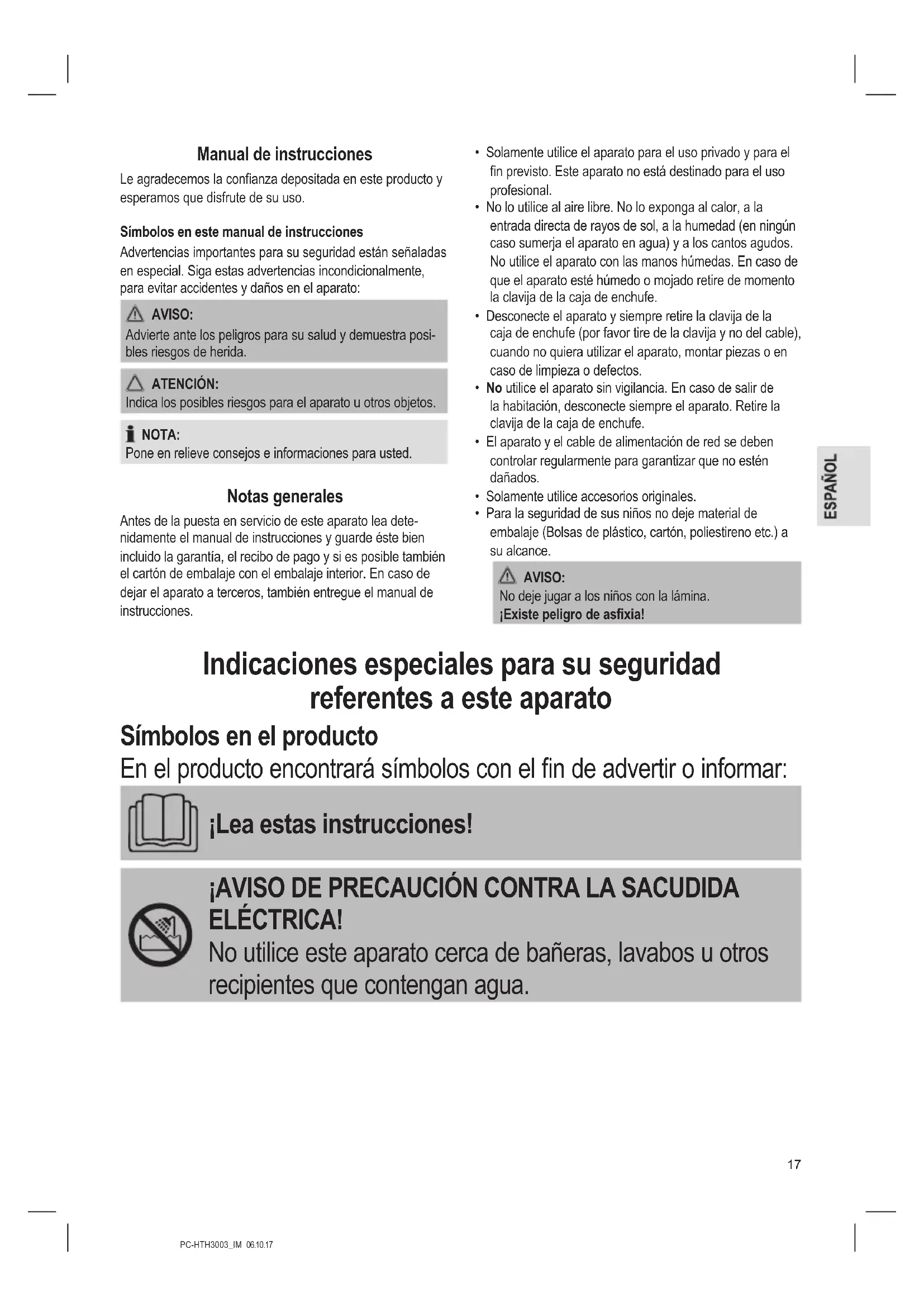 - Para la seguridad de sus niños no deje material de embalaje (Bolsas de plástico, cartón, poliestireno etc.) a su alcance. AVISO: No deje jugar a los niños con la lámina. ¡Existe peligro de asxia! Indicaciones especiales para su seguridad referentes a este aparato Símbolos en el producto En el producto encontrará símbolos con el n de advertir o informar: ¡Lea estas instrucciones! ¡AVISO DE PRECAUCIÓN CONTRA LA SACUDIDA ELÉCTRICA! No utilice este aparato cerca de bañeras, lavabos u otros recipientes que contengan agua.PC-HTH3003_IM 06.10.17