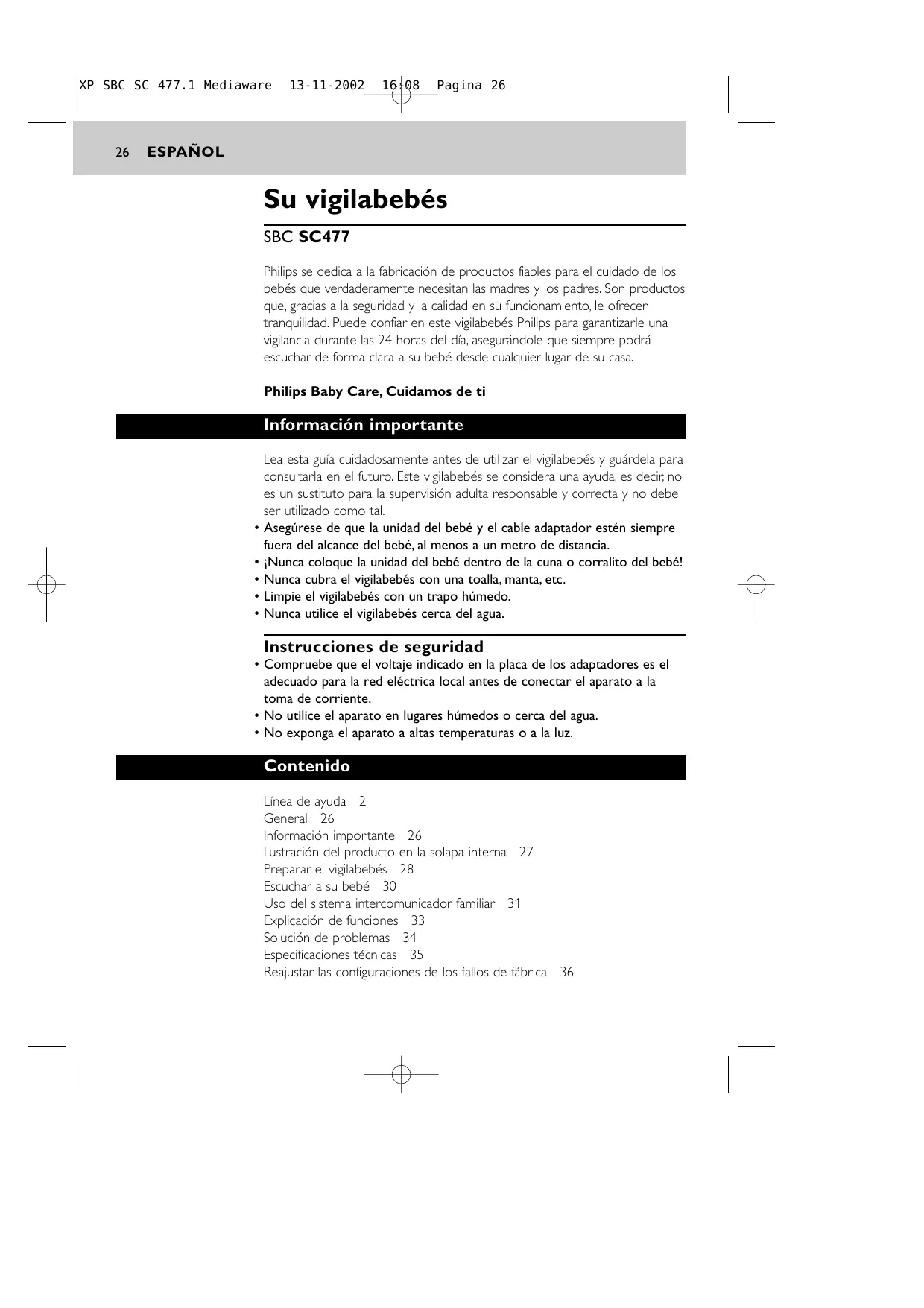 Su vigilabebés SBC SC477 Philips se dedica a la fabricación de productos fiables para el cuidado de los bebés que verdaderamente necesitan las madres y los padres. Son productos que, gracias a la seguridad y la calidad en su funcionamiento, le ofrecen tranquilidad. Puede confiar en este vigilabebés Philips para garantizarle una vigilancia durante las 24 horas del día, asegurándole que siempre podrá escuchar de forma clara a su bebé desde cualquier lugar de su casa. Philips Baby Care, Cuidamos de ti Información importante