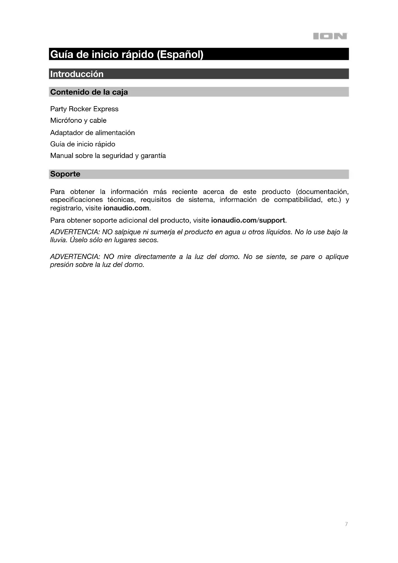 Guía de inicio rápido (Español) Introducción Contenido de la caja Party Rocker Express Micrófono y cable Adaptador de alimentación Guía de inicio rápido Manual sobre la seguridad y garantía Soporte Para obtener la información más reciente acerca de este producto (documentación, especificaciones técnicas, requisitos de sistema, información de compatibilidad, etc.) y registrarlo, visite ionaudio.com. Para obtener soporte adicional del producto, visite ionaudio.com/support. ADVERTENCIA: NO salpique ni sumerja el producto en agua u otros líquidos. No lo use bajo la lluvia. Úselo sólo en lugares secos. ADVERTENCIA: NO mire directamente a la luz del domo. No se siente, se pare o aplique presión sobre la luz del domo.8