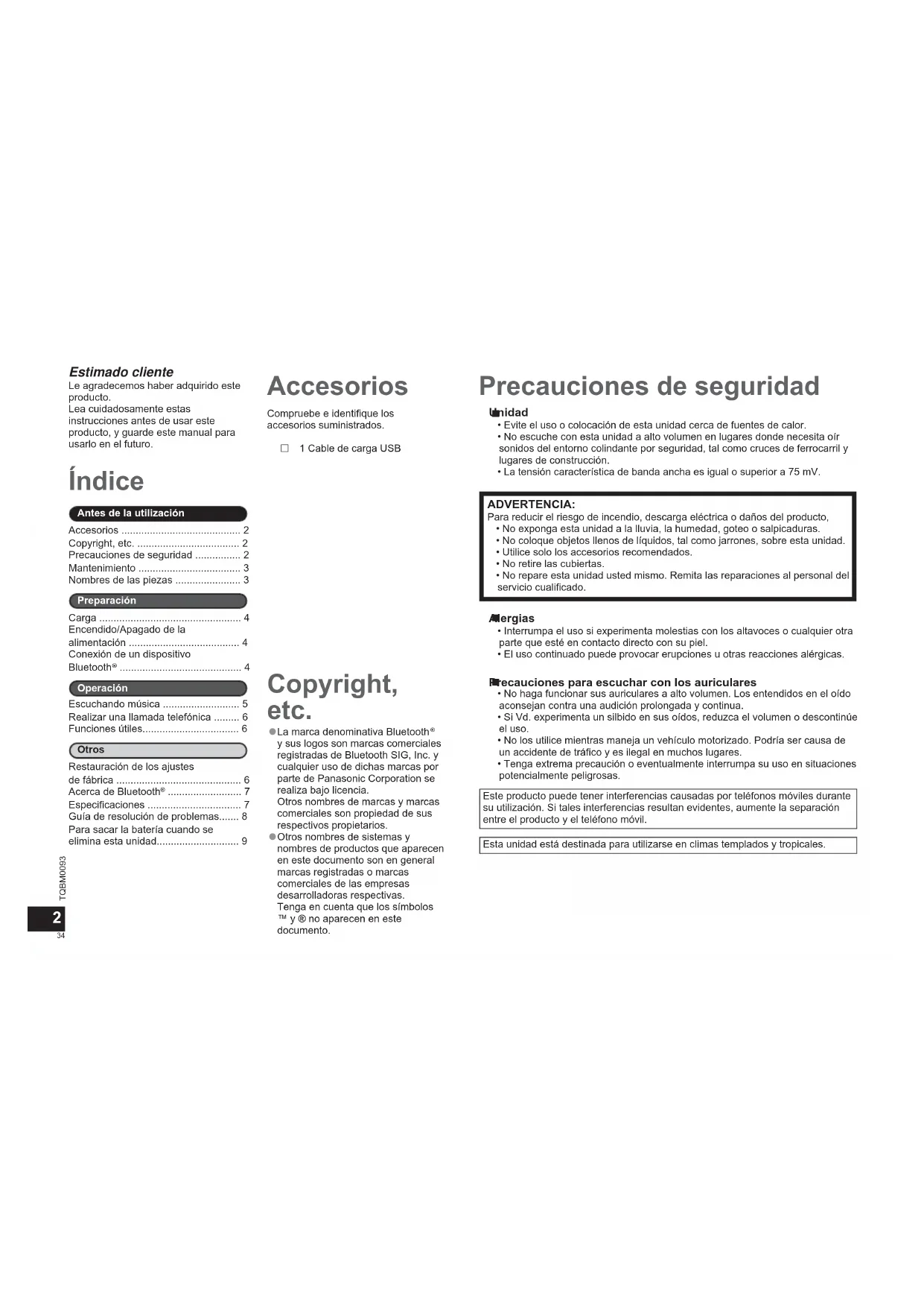Unidad • Evite el uso o colocación de esta unidad cerca de fuentes de calor. • No escuche con esta unidad a alto volumen en lugares donde necesita oír sonidos del entorno colindante por seguridad, tal como cruces de ferrocarril y lugares de construcción. • La tensión característica de banda ancha es igual o superior a 75 mV.ADVERTENCIA:Para reducir el riesgo de incendio, descarga eléctrica o daños del producto, • No exponga esta unidad a la lluvia, la humedad, goteo o salpicaduras. • No coloque objetos llenos de líquidos, tal como jarrones, sobre esta unidad. • Utilice solo los accesorios recomendados. • No retire las cubiertas. • No repare esta unidad usted mismo. Remita las reparaciones al personal del servicio cualificado. Alergias • Interrumpa el uso si experimenta molestias con los altavoces o cualquier otra parte que esté en contacto directo con su piel. • El uso continuado puede provocar erupciones u otras reacciones alérgicas. Precauciones para escuchar con los auriculares • No haga funcionar sus auriculares a alto volumen. Los entendidos en el oído aconsejan contra una audición prolongada y continua. • Si Vd. experimenta un silbido en sus oídos, reduzca el volumen o descontinúe el uso. • No los utilice mientras maneja un vehículo motorizado. Podría ser causa de un accidente de tráfico y es ilegal en muchos lugares. • Tenga extrema precaución o eventualmente interrumpa su uso en situaciones potencialmente peligrosas.Este producto puede tener interferencias causadas por teléfonos móviles durante su utilización. Si tales interferencias resultan evidentes, aumente la separación entre el producto y el teléfono móvil.Esta unidad está destinada para utilizarse en climas templados y tropicales. Precauciones de seguridad RP-HF400B_E(TQBM0093).indb 34RP-HF400B_E(TQBM0093).indb 34 2017/03/17 21:21:402017/03/17 21:21:40TQBM0093