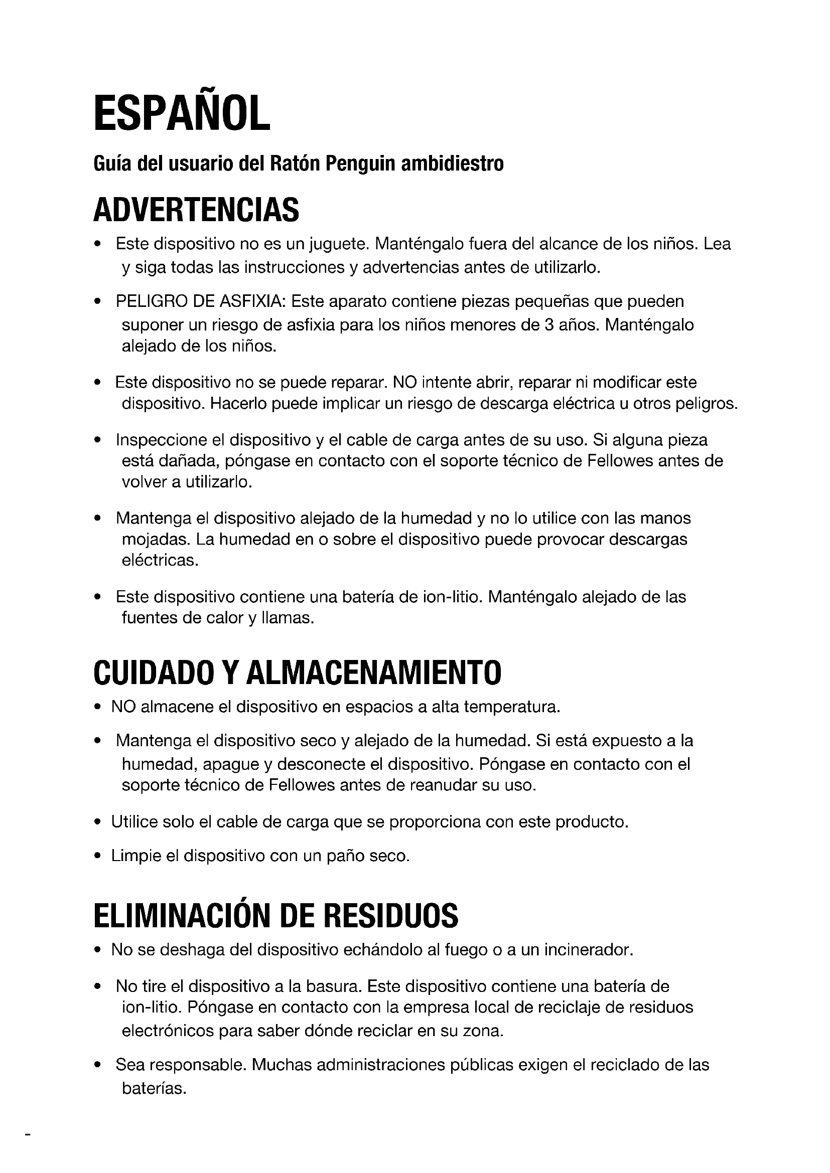 - Pruebe el ratón Penguin en otro PC/portátil para comprobar si todavía existe el problema.INFORMACIÓN IMPORTANTE Salud Si pasa largos periodos de tiempo en su estación de trabajo sin hacer descansos con frecuencia, puede sufrir molestias. Si las molestias persisten, consulte con un profesional sanitario cualificado. Consejos para el usuario/Mantenimiento Evite el contacto con desinfectantes/cremas de manos medicinales cuando utilice el ratón Penguin. Limpie con regularidad el polvo y la suciedad acumulada de la parte inferior del ratón Penguin para garantizar un deslizamiento uniforme. Limitación de responsabilidades Hacemos todo lo posible para garantizar que la información y los procedimientos de esta guía sean precisos y completos. No se acepta ninguna responsabilidad por ningún error u omisión, y nos reservamos el derecho a realizar cualquier modificación sin previo aviso en este documento. Garantía limitada de 2 años del Ratón vertical Penguin ambidiestro de Fellowes Fellowes, Inc. (la “Empresa”) garantiza que este producto no presentará defectos de material y mano de obra durante dos (2) años desde la fecha de compra original del producto. Si un defecto así aparece durante el período de garantía, la Empresa (a su exclusiva discreción) reparará o sustituirá el producto defectuoso sin cargos por la reparación ni por las piezas o reembolsará el precio de la compra. La Empresa puede requerir que el producto sea devuelto a cargo del cliente a una ubicación designada por el Servicio de atención al cliente. Esta garantía solo se aplica al primer comprador al por menor y no cubre reclamaciones debidas al mal uso, no seguir las instrucciones sobre instalación o uso, negligencia, uso de accesorios no permitidos, uso comercial, uso en un voltaje o una corriente distintos a los especificados en el producto, o reparación no autorizada durante el período de garantía en condiciones distintas a las cubiertas por garantía.LA DURACIÓN DE TODA GARANTÍA IMPLÍCITA, LO QUE INCLUYE, PERO SIN LIMITACIÓN, CUALQUIER GARANTÍA IMPLÍCITA DE COMERCIABILIDAD O IDONEIDAD PARA UN FIN PARTICULAR, QUEDA EXPRESAMENTE LIMITADA A LA DURACIÓN DE ESTA GARANTÍA LIMITADA. A MENOS QUE LO EXIJA LA LEGISLACIÓN APLICABLE, LA ÚNICA SOLUCIÓN PARA EL CLIENTE POR EL INCLUPLIMIENTO DE ESTA GARANTÍA, CUALQUIER GARANTÍA IMPLÍCITA O CUALQUIER OTRA OBLIGACIÓN QUE SURJA POR MINISTERIO DE LA LEY SE LIMITARÁ A LO ESPECIFICADO EN EL PRESENTE DOCUMENTO A REPARAR, SUSTITUIR O REEMBOLSAR EL PRECIO DE LA COMPRA, SEGÚN ÚNICAMENTE EL CRITERIO DE LA EMPRESA. EN NINGUNA CIRCUNSTANCIA LA EMPRESA, SUS FILIALES,