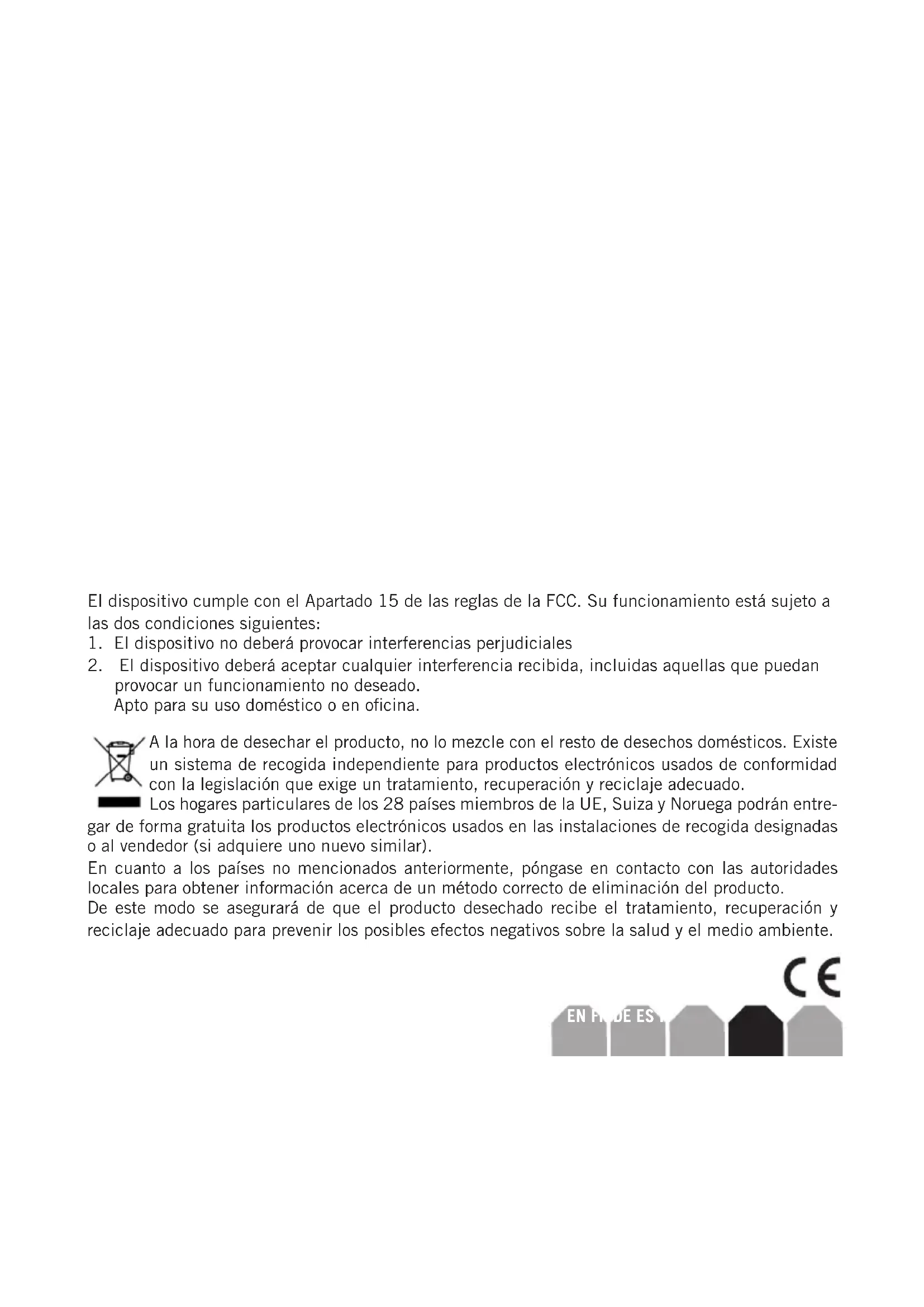 A la hora de(deschar el producto, no lo mezcle con el resto de desechos domesticos. Existe un systema de recogida independiente para productos electronicos usados de conformidad con la legislacion que exige un tratamento, recuperacion y reciclaje adecuado.