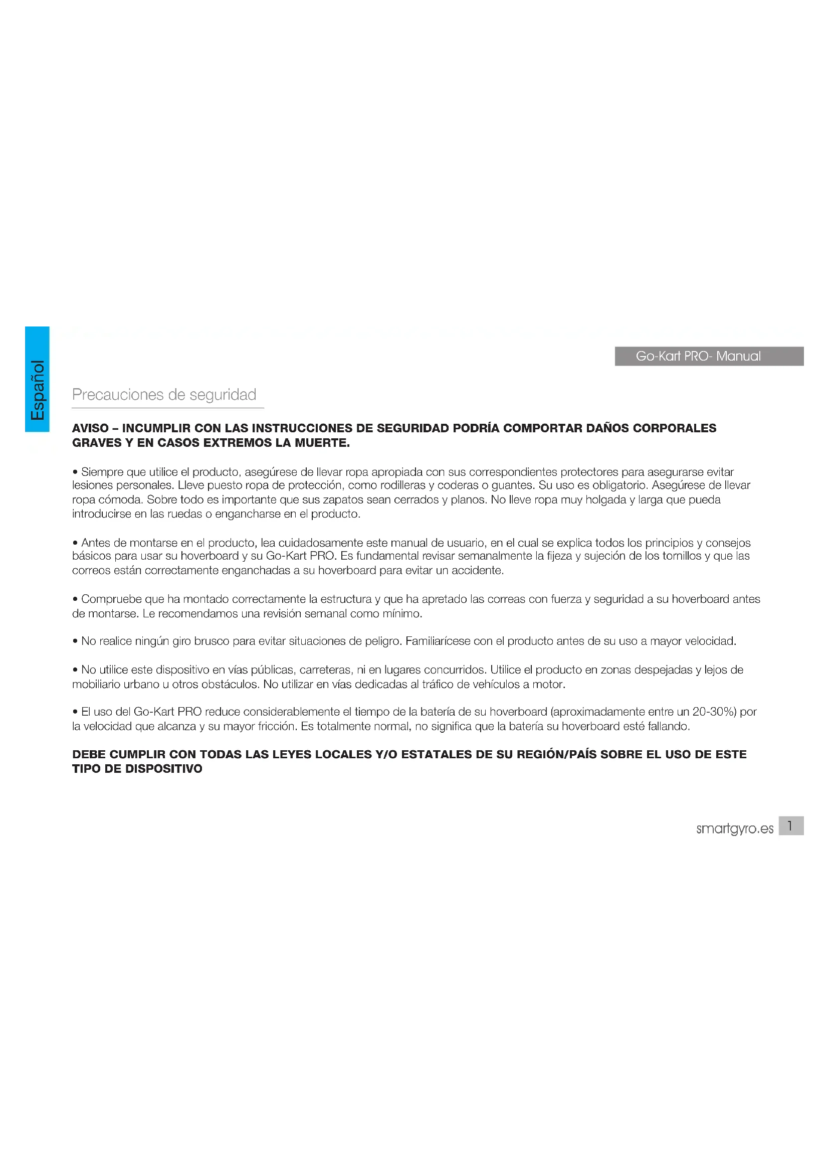 X1- Manual Manual de usuario Go-Kart PROsmartgyro.es Precauciones de seguridad AVISO – INCUMPLIR CON LAS INSTRUCCIONES DE SEGURIDAD PODRÍA COMPORTAR DAÑOS CORPORALES GRAVES Y EN CASOS EXTREMOS LA MUERTE.