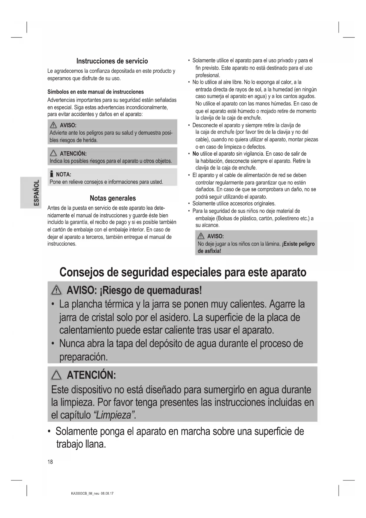 Demasiado polvo de café en el ltro. Granos de café en el café. El ltro de papel es muy pequeño. Utilice un ltro de papel con tamaño “1 x 4”. Demasiado polvo de café en el ltro. Utilice menos polvo de café. El proceso de prepa- ración tarda mucho. Depósitos de cal en el aparato. Descalcique el aparato tal como se describe. El aparato se apaga automáticamente. Esto no es un fallo de funcionamiento del aparato. Para cumplir la Directiva Ecodiseño (2009 / 125 / CE), el aparato se apaga automáticamente transcurridos 40 minutos después de nalizar el proceso de preparar el café. Datos técnicos Modelo: ................................................................. KA 3003 CB Suministro de tensión: ......................... 220 - 240 V~, 50 / 60 Hz Consumo de energía: ...................................................1000 W Cantidad de llenado: ....................................................1,7 litros Clase de protección: ................................................................ Peso neto: ...........................................................aprox. 1,60 kg El derecho de realizar modicaciones técnicas y de diseño en el curso del desarrollo continuo del producto está reser- vado. Este dispositivo cumple con todas las directrices CE actua- les, como la directriz de compatibilidad electromagnética y de bajo voltaje, y está fabricada según las últimas normas de seguridad. Eliminación Signicado del símbolo “cubo de basura” Cuide del medio ambiente, no deseche aparatos eléctricos con los residuos domésticos. Deseche los aparatos eléctricos obsoletos o defectuosos en los puntos de recolección municipales. Ayude a evitar potenciales impactos medioambientales y en la salud por una eliminación de residuos inadecuada. Contribuye al reciclaje y otros modos de uso de aparatos eléctricos y electrónicos viejos. Su municipalidad le proporcionará información sobre los puntos de recolección.23 KA3003CB_IM_neu 08.08.17 Istruzioni per l’uso Grazie per aver scelto il nostro prodotto. Vi auguriamo un buon utilizzo del dispositivo. Simboli per questo manuale di istruzioni per l’uso Le indicazioni importanti per la propria sicurezza sono indicati appropriatamente. Osservare assolutamente queste indica- zioni, per evitare incidenti e danni all’apparecchio: AVVISO: Previene i rischi della propria salute ed indica possibili rischi di ferite. ATTENZIONE: Indica possibili pericoli per l’apparecchio o altri oggetti. NOTA: Mette in risalto consigli ed informazioni. Note generali Prima di mettere in funzione questo apparecchio, leggere molto attentamente le istruzioni per l’uso e conservarle con cura unitamente al certificato di garanzia, allo scontrino e, se possibile, alla scatola di cartone con la confezione interna. Se passate l‘apparecchio a terzi, consegnate anche le istruzioni per l‘uso.