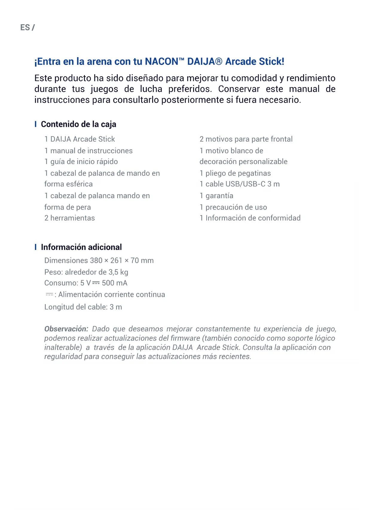 nacongamingde @NaconGER NacongamingDE Nacon Deutschland“1”, “PlayStation”, “PS5”, “PS4” and “PlayStation Shapes Logo” are registered trademarks or trademarks of Sony Interactive Entertainment Inc. All other trademarks are the property of their respective owners. Manufactured and distributed under license by Sony Interactive Entertainment. © 2022 NACON Made in China START GUIDE For PS5™, PS4™ NC4529ES / ¡Entra en la arena con tu NACON™ DAIJA® Arcade Stick! Este producto ha sido diseñado para mejorar tu comodidad y rendimiento durante tus juegos de lucha preferidos. Conservar este manual de instrucciones para consultarlo posteriormente si fuera necesario. I Contenido de la caja I Información adicional Dimensiones 380 × 261 × 70 mm Peso: alrededor de 3,5 kg Consumo: 5 V 500 mA : Alimentación corriente continua Longitud del cable: 3 m Observación: Dado que deseamos mejorar constantemente tu experiencia de juego, podemos realizar actualizaciones del rmware (también conocido como soporte lógico inalterable) a través de la aplicación DAIJA Arcade Stick. Consulta la aplicación con regularidad para conseguir las actualizaciones más recientes. 1 DAIJA Arcade Stick 1 manual de instrucciones 1 guía de inicio rápido 1 cabezal de palanca de mando en forma esférica 1 cabezal de palanca mando en forma de pera 2 herramientas 2 motivos para parte frontal 1 motivo blanco de decoración personalizable 1 pliego de pegatinas 1 cable USB/USB-C 3 m 1 garantía 1 precaución de uso 1 Información de conformidadES / I Descripción de los elementos 01 Botón de desbloqueo de la tapa superior 02 Tornillo de la parte frontal 03 Palanca de mando (solo modo digital) 04 Botones de acción (cruz, círculo, cuadrado, triángulo / L1 / R1 / L2 / R2) 05 Salida cascos 3,5 mm 06 Led de jugador 07 Botón PS 08 CREATE (Modo PS5™) / SHARE (Modo PS4™) 09 Botón RSB 10 Botón LSB 11 Opciones 12 Selección del modo de la palanca 13 Selección de la plataforma (PS5™, PS4™, PC*) 14 Compartimento para guardar el cable (en el interior) 15 Botón de Perl 16 Luces de perl 17 Función para bloqueo (LOCK) 18 Conector USB-C 19 Touch pad