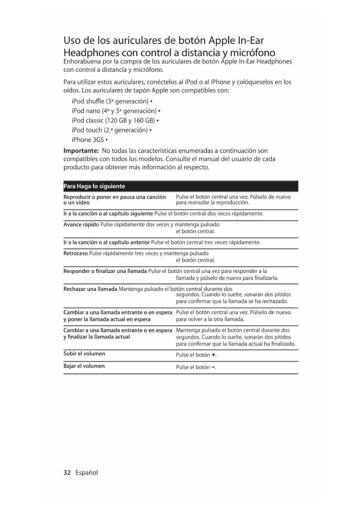 ODER IRGENDEINEM SONSTIGEN TEIL DES PRODUKTES GESPEICHERT SIND, FÜR WELCHES GEWÄHRLEISTUNG IN ANSPRUCH GENOMMEN WIRD. Ihr Produkt wird in der Originalkonguration wie bei Erwerb, vorbehaltlich zwischenzeitlicher Updates an Sie zurückgesandt. Es obliegt Ihnen, Softwareprogramme, Daten und Passwörter erneut auf dem Produkt zu installieren. Die Wiederherstellung und/ oder Wiederinstallation von Softwareprogrammen oder Nutzerdaten sind nicht Bestandteil der Leistungen im Rahmen der Gewährleistung.32 Español Español 33 Uso de los auriculares de botón Apple In-Ear Headphones con control a distancia y micrófono Enhorabuena por la compra de los auriculares de botón Apple In-Ear Headphones con control a distancia y micrófono. Para utilizar estos auriculares, conéctelos al iPod o al iPhone y colóqueselos en los oídos. Los auriculares de tapón Apple son compatibles con: iPod shue (3ª generación) Â iPod nano (4ª y 5ª generación) Â iPod classic (120 GB y 160 GB) Â iPod touch (2.ª generación) Â iPhone 3GS Â Importante: No todas las características enumeradas a continuación son compatibles con todos los modelos. Consulte el manual del usuario de cada producto para obtener más información al respecto. Para Haga lo siguiente Reproducir o poner en pausa una canción o un vídeo Pulse el botón central una vez. Púlselo de nuevo para reanudar la reproducción. Ir a la canción o al capítulo siguiente Pulse el botón central dos veces rápidamente. Avance rápido Pulse rápidamente dos veces y mantenga pulsado el botón central. Ir a la canción o al capítulo anterior Pulse el botón central tres veces rápidamente. Retroceso Pulse rápidamente tres veces y mantenga pulsado el botón central. Responder o nalizar una llamada Pulse el botón central una vez para responder a la llamada y púlselo de nuevo para nalizarla. Rechazar una llamada Mantenga pulsado el botón central durante dos segundos. Cuando lo suelte, sonarán dos pitidos para conrmar que la llamada se ha rechazado. Cambiar a una llamada entrante o en espera y poner la llamada actual en espera Pulse el botón central una vez. Púlselo de nuevo para volver a la otra llamada. Cambiar a una llamada entrante o en espera y nalizar la llamada actual Mantenga pulsado el botón central durante dos segundos. Cuando lo suelte, sonarán dos pitidos para conrmar que la llamada actual ha nalizado. Subir el volumen Pulse el botón ∂. Bajar el volumen Pulse el botón D.32 Español Español 33 Uso de VoiceOver Algunos modelos de iPod y iPhone le permiten usar VoiceOver para anunciar el título, nombre de artista y lista de reproducción de la canción que se está reproduciendo y para cambiar a otra lista de reproducción. Consulte el manual del usuario de su dispositivo para saber si admite esta característica. Para usar VoiceOver, mantenga pulsado el botón central y escuchará el título y el nombre del artista de la canción. Siga pulsando el botón hasta que escuche un tono y entonces deje de pulsarlo. VoiceOver anunciará la lista de reproducción actual y, a continuación, todas las listas de reproducción. Pulse el botón central cuando escuche la lista de reproducción que desee seleccionar. Cómo obtener la mejor calidad de sonido Para obtener la mejor calidad de sonido con los auriculares de botón Apple In-Ear Headphones con control a distancia y micrófono, deben usarse los capuchones que se incluyen. Pruebe los tres tamaños disponibles (S, M, L) en cada oído y elija el que le resulte más cómodo para su canal auditivo (como un par de tapones para los oídos). Con la conguración adecuada, se bloquea la mayor parte de los ruidos del exterior y la calidad de los graves mejora al reproducir música. Limpieza o sustitución de los tapones de malla Los tapones de malla protegen los altavoces de los auriculares de los possibles daños. Si están obstruidos por la cera de los oídos o el sonido ha perdido nitidez, límpielos o sustitúyalos (se incluye un par de tapones adicionales). Para limpiar los tapones de malla, extraiga los capuchones de silicona y luego desenrósquelos. Déjelos en remojo en agua muy caliente con una gota de lavavajillas durante 30 minutos. Cuando estén completamente limpios, aclárelos con agua fría y séquelos bien antes de volver a colocarlos en los auriculares y de poner de nuevo los capuchones de silicona. ADVERTENCIA: Los auriculares no deben utilizarse sin los capuchones de silicona. Antes de colocarlos, asegúrese de que los tapones de malla están jados correctamente.34 Español Español 35 Información importante sobre seguridad Prevención de la pérdida auditiva ADVERTENCIA: El uso de auriculares a un volumen elevado puede derivar en una pérdida permanente de audición. Con el tiempo, puede acostumbrarse a un volumen de sonido más alto, que puede resultar aparentemente normal, pero que puede dañar su capacidad de audición. Ajuste el volumen a un nivel adecuado antes de que esto ocurra. Si oye un pitido o un murmullo sordo en el oído, baje el volumen o deje de usar los auriculares y acuda al médico. Cuanto más alto ajuste el volumen, más probabilidades hay de que su capacidad de audición se vea afectada en menos tiempo. Los especialistas recomiendan que proteja sus oídos del siguiente modo: Limite el tiempo de utilización de los auriculares a un volumen elevado. Â No suba el volumen con el n de aislarse de ambientes ruidosos. Â Si no puede oír a la gente que está hablando cerca suyo, baje el volumen. Â Fuera del alcance de los niños ADVERTENCIA: Este producto contiene piezas de pequeño tamaño que pueden presentar riesgo de atragantamiento. por lo que debe mantenerse siempre alejado de los niños, sobre todo de los menores de 3 años. Uso prohibido durante la conducción Importante: No se recomienda el uso de auriculares durante la conducción de un vehículo (en algunos países está prohibido). Consulte y respete las leyes y normativas sobre el uso de auricular