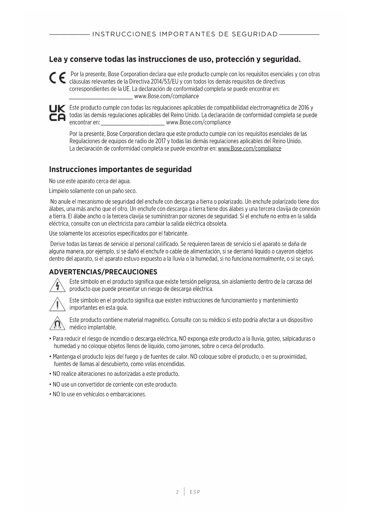 Este producto cumple con todas las regulaciones aplicables de compatibiliad electromagnética de 2016 y todas lasdemasregulaciones aplicables delReino Unido.Ladeclaraciondeconformidadcompleta se puebeencurar en: www.Bose.com/compliance
