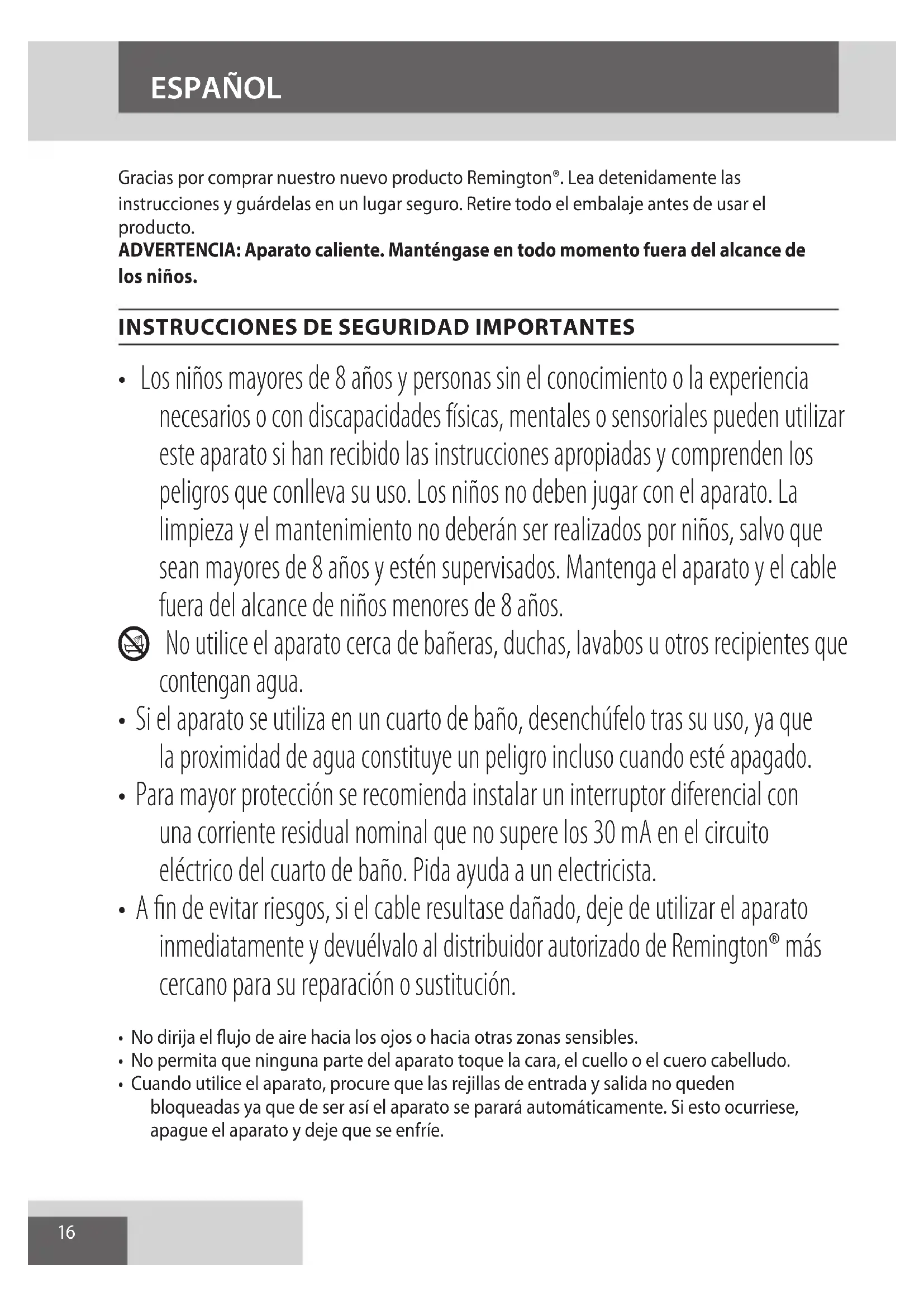 - A fin de evitar riesgos, si el cable resultase dañado, deje de utilizar el aparato inmediatamente y devuélvalo al distribuidor autorizado de Remington® más cercano para su reparación o sustitución.