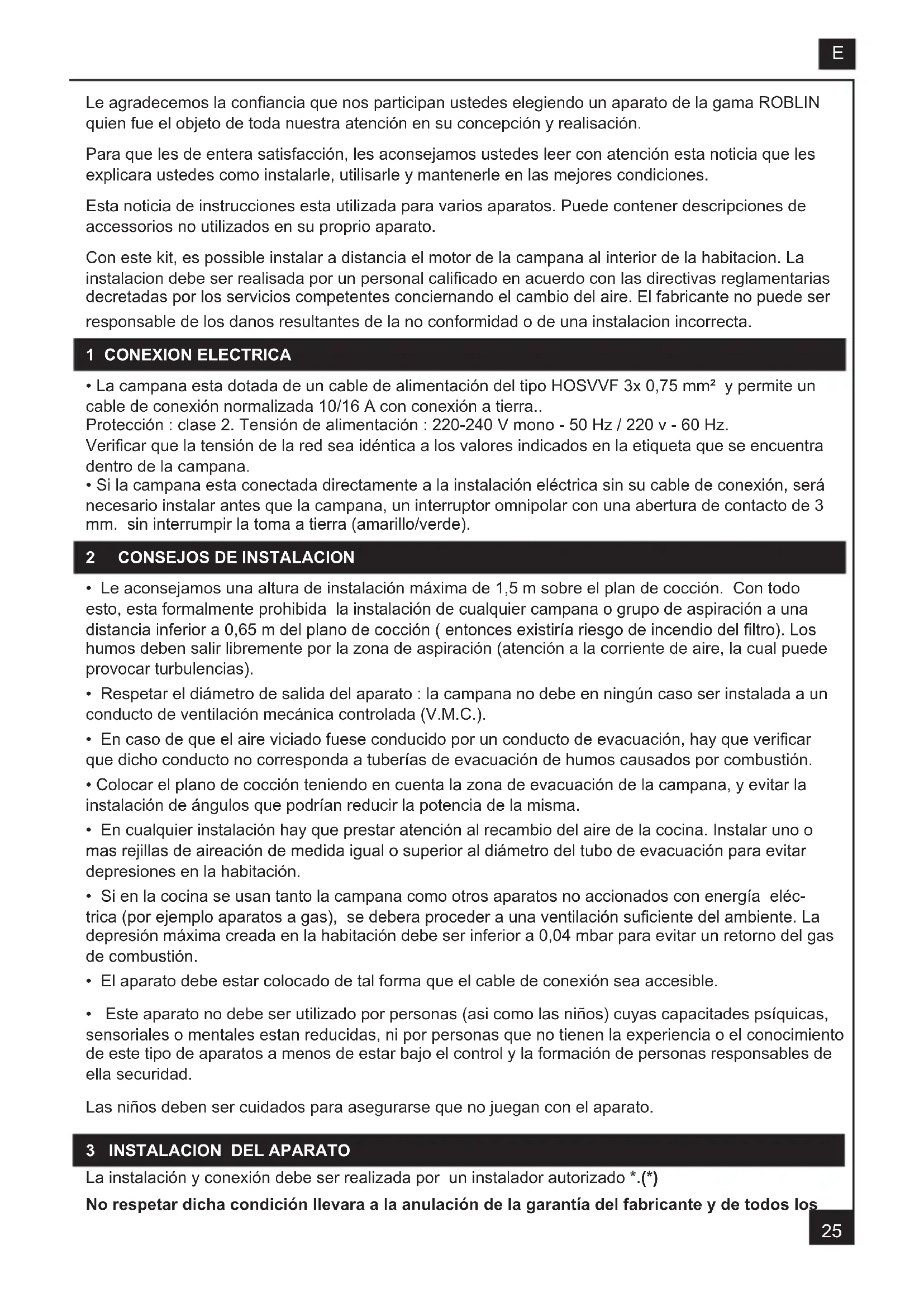- La campana esta dotada de un cable de alimentación del tipo HOSVVF 3x 0,75 mm² y permite un cable de conexión normalizada 10/16 A con conexión a tierra.. Protección : clase 2. Tensión de alimentación : 220-240 V mono - 50 Hz / 220 v - 60 Hz. Vericar que la tensión de la red sea idéntica a los valores indicados en la etiqueta que se encuentra dentro de la campana.