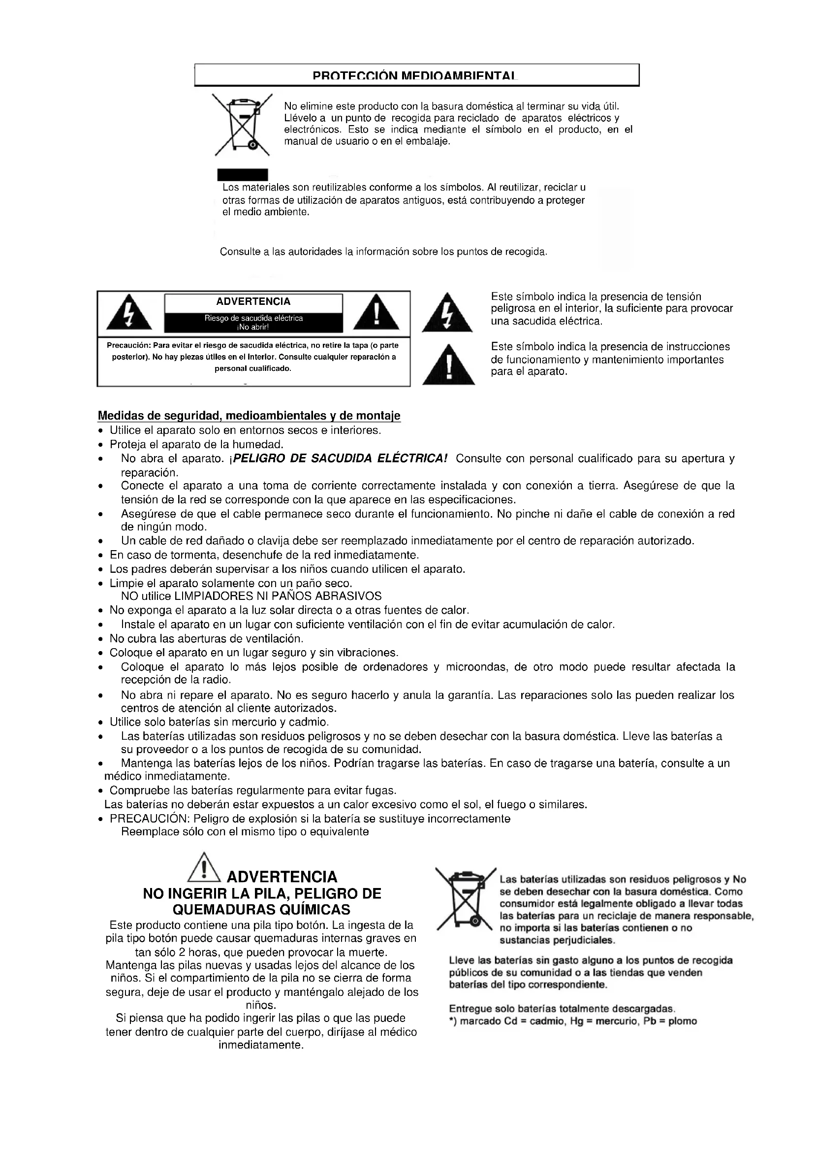 Medidas de seguridad, medioambientales y de montaje Utilice el aparato solo en entornos secos e interiores. Proteja el aparato de la humedad. No abra el aparato. ¡PELIGRO DE SACUDIDA ELÉCTRICA! Consulte con personal cualificado para su apertura y reparación. Conecte el aparato a una toma de corriente correctamente instalada y con conexión a tierra. Asegúrese de que la tensión de la red se corresponde con la que aparece en las especificaciones. Asegúrese de que el cable permanece seco durante el funcionamiento. No pinche ni dañe el cable de conexión a red de ningún modo. Un cable de red dañado o clavija debe ser reemplazado inmediatamente por el centro de reparación autorizado. En caso de tormenta, desenchufe de la red inmediatamente. Los padres deberán supervisar a los niños cuando utilicen el aparato. Limpie el aparato solamente con un paño seco. NO utilice LIMPIADORES NI PAÑOS ABRASIVOS No exponga el aparato a la luz solar directa o a otras fuentes de calor. Instale el aparato en un lugar con suficiente ventilación con el fin de evitar acumulación de calor. No cubra las aberturas de ventilación. Coloque el aparato en un lugar seguro y sin vibraciones. Coloque el aparato lo más lejos posible de ordenadores y microondas, de otro modo puede resultar afectada la recepción de la radio. No abra ni repare el aparato. No es seguro hacerlo y anula la garantía. Las reparaciones solo las pueden realizar los centros de atención al cliente autorizados. Utilice solo baterías sin mercurio y cadmio. Las baterías utilizadas son residuos peligrosos y no se deben desechar con la basura doméstica. Lleve las baterías a su proveedor o a los puntos de recogida de su comunidad. Mantenga las baterías lejos de los niños. Podrían tragarse las baterías. En caso de tragarse una batería, consulte a un médico inmediatamente. Compruebe las baterías regularmente para evitar fugas. Las baterías no deberán estar expuestos a un calor excesivo como el sol, el fuego o similares. PRECAUCIÓN: Peligro de explosión si la batería se sustituye incorrectamente Reemplace sólo con el mismo tipo o equivalente ADVERTENCIA