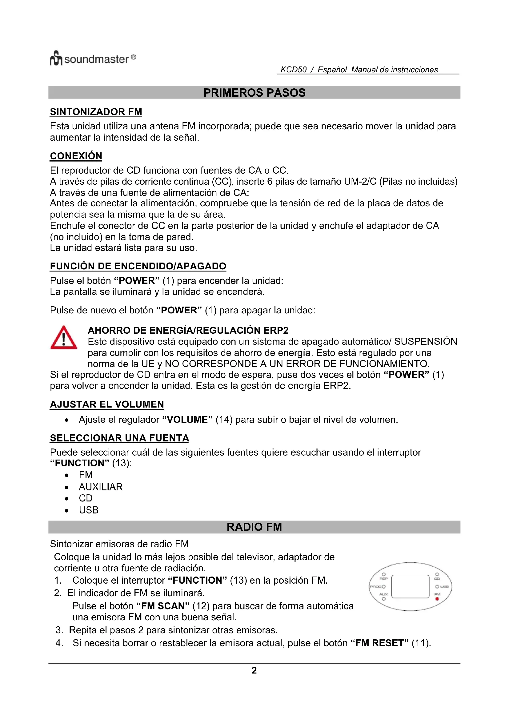 - No abra el aparato. ¡PELIGRO DE SACUDIDA ELÉCTRICA! Consulte con personal cualificado para su apertura y reparación. Conecte el aparato a una toma de corriente correctamente instalada y con conexión a tierra. Asegúrese de que la tensión de la red se corresponde con la que aparece en las especificaciones. Asegúrese de que el cable permanece seco durante el funcionamiento. No pinche ni dañe el cable de conexión a red de ningún modo. Un cable de red dañado o clavija debe ser reemplazado inmediatamente por el centro de reparación autorizado. En caso de tormenta, desenchufe de la red inmediatamente. Los padres deberán supervisar a los niños cuando utilicen el aparato. Limpie el aparato solamente con un paño seco. NO utilice LIMPIADORES NI PAÑOS ABRASIVOS No exponga el aparato a la luz solar directa o a otras fuentes de calor. Instale el aparato en un lugar con suficiente ventilación con el fin de evitar acumulación de calor. No cubra las aberturas de ventilación. Coloque el aparato en un lugar seguro y sin vibraciones. Coloque el aparato lo más lejos posible de ordenadores y microondas, de otro modo puede resultar afectada la recepción de la radio. No abra ni repare el aparato. No es seguro hacerlo y anula la garantía. Las reparaciones solo las pueden realizar los centros de atención al cliente autorizados. El dispositivo lleva incorporado un “Láser de Clase 1”. Evite la exposición al haz de láser porque podría dañarse la vista. Utilice solo baterías sin mercurio y cadmio. Las baterías utilizadas son residuos peligrosos y no se deben desechar con la basura doméstica. Lleve las baterías a su proveedor o a los puntos de recogida de su comunidad. Mantenga las baterías lejos de los niños. Podrían tragarse las baterías. En caso de tragarse una batería, consulte a un médico inmediatamente. Compruebe las baterías regularmente para evitar fugas.KCD50 / Español Manual de instrucciones
