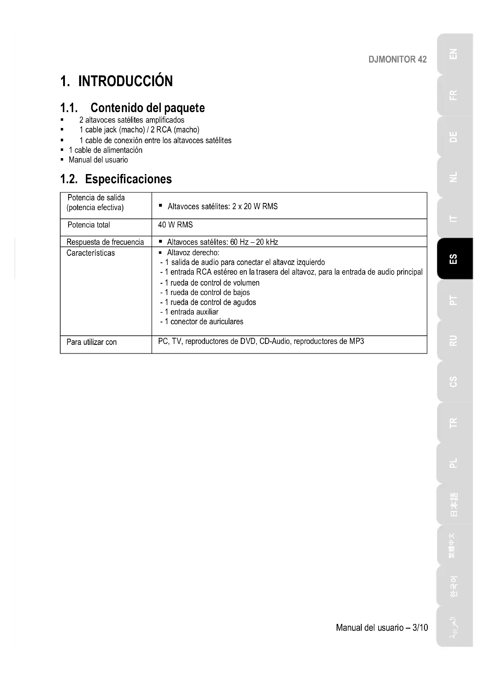 Altavoz derecho: - 1 salida de audio para conectar el altavoz izquierdo - 1 entrada RCA estéreo en la trasera del altavoz, para la entrada de audio principal - 1 rueda de control de volumen - 1 rueda de control de bajos - 1 rueda de control de agudos - 1 entrada auxiliar - 1 conector de auriculares Para utilizar con PC, TV, reproductores de DVD, CD-Audio, reproductores de MP3DJMONITOR 42 4/10 – Manual del usuario 1.3. Recomendaciones - Coloca los altavoces satélites sobre una superficie plana para evitar que se puedan caer. - No abras el kit de altavoces, ya que te arriesgas a dañar sus componentes internos. - Este kit de altavoces está pensado para ser utilizado en un ambiente templado. - Para evitar el riesgo de incendio o descarga eléctrica, mantén alejado el kit de altavoces de: - lluvia o humedad, así como de fluidos (agua, productos químicos u otros líquidos), - fuentes de calor como calentadores, estufas u otros dispositivos productores de calor (incluyendo amplificadores), - la luz directa del sol. - No expongas el kit de altavoces a gotas ni a salpicaduras de agua. - No coloques ningún objeto lleno de líquido (vaso, jarrón...) sobre el kit de altavoces. - Desenchufa el cable de alimentación si no piensas utilizar el kit de altavoces durante un período de tiempo prolongado. Para desconectar el cable de alimentación, sujeta la clavija y tira de ella; no tires nunca del cable. - Asegúrate de que se pueda acceder fácilmente a la clavija de alimentación del kit enchufado a una toma eléctrica. - Desenchufa el kit de altavoces antes de limpiarlo. Utiliza un paño húmedo y evita utilizar limpiadores en aerosol. - La clavija de alimentación del kit de altavoces sirve para apagarlo y, por lo tanto, debe ser fácilmente accesible en todo momento. - En la parte trasera de los altavoces están las indicaciones legales.
