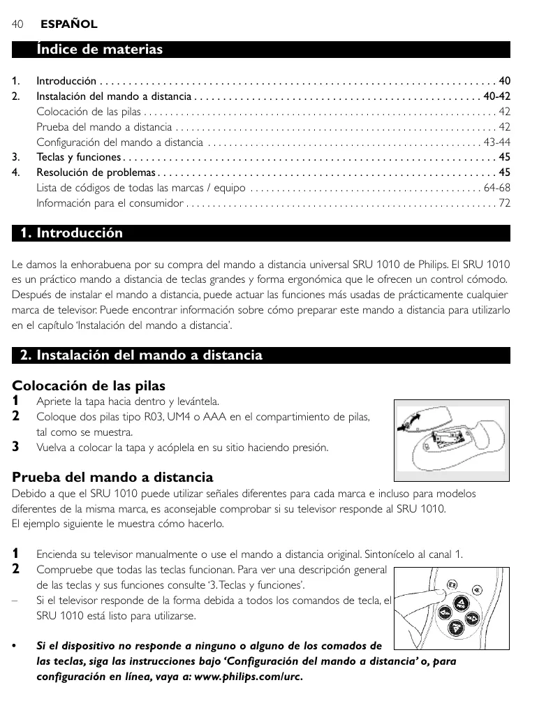 Instalación del mando a distancia . . . . . . . . . . . . . . . . . . . . . . . . . . . . . . . . . . . . . . . . . . . . . . . . . . 40-42 Colocación de las pilas . . . . . . . . . . . . . . . . . . . . . . . . . . . . . . . . . . . . . . . . . . . . . . . . . . . . . . . . . . . . . . . . . . . 42 Prueba del mando a distancia . . . . . . . . . . . . . . . . . . . . . . . . . . . . . . . . . . . . . . . . . . . . . . . . . . . . . . . . . . . . . 42 Configuración del mando a distancia . . . . . . . . . . . . . . . . . . . . . . . . . . . . . . . . . . . . . . . . . . . . . . . . . . . . 43-44 Teclas y funciones . . . . . . . . . . . . . . . . . . . . . . . . . . . . . . . . . . . . . . . . . . . . . . . . . . . . . . . . . . . . . . . . . 45 Resolución de problemas . . . . . . . . . . . . . . . . . . . . . . . . . . . . . . . . . . . . . . . . . . . . . . . . . . . . . . . . . . . 45 Lista de códigos de todas las marcas / equipo . . . . . . . . . . . . . . . . . . . . . . . . . . . . . . . . . . . . . . . . . . . . 64-68 Información para el consumidor . . . . . . . . . . . . . . . . . . . . . . . . . . . . . . . . . . . . . . . . . . . . . . . . . . . . . . . . . . . 72