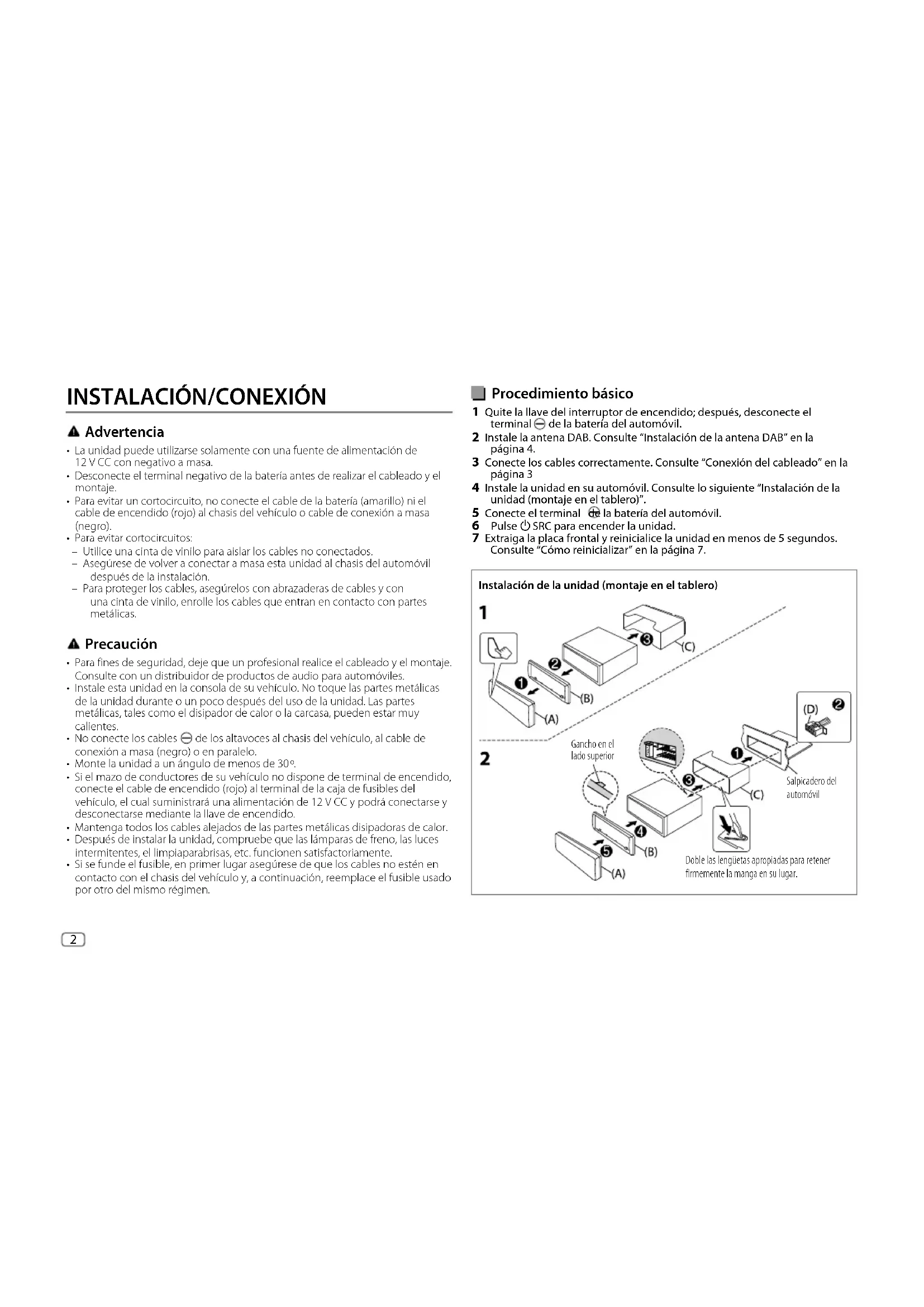 JS_KWD_QSG_KDC_BT730U_EN_IT.indd 12JS_KWD_QSG_KDC_BT730U_EN_IT.indd 12 20/8/2018 10:56:07 AM20/8/2018 10:56:07 AMJS_KWD_QSG_KDC_BT730U_EN_IT.indd 13JS_KWD_QSG_KDC_BT730U_EN_IT.indd 13 20/8/2018 10:56:07 AM20/8/2018 10:56:07 AM2 Data Size: B6L (182 mm x 128 mm)Book Size: B6L (182 mm x 128 mm) Procedimiento básico 1 Quite la llave del interruptor de encendido; después, desconecte el terminal de la batería del automóvil. 2 Instale la antena DAB. Consulte “Instalación de la antena DAB” en la página4. 3 Conecte los cables correctamente. Consulte “Conexión del cableado” en la página3 4 Instale la unidad en su automóvil. Consulte lo siguiente “Instalación de la unidad (montaje en el tablero)”. 5 Conecte el terminal de la batería del automóvil. 6 Pulse B SRC para encender la unidad. 7 Extraiga la placa frontal y reinicialice la unidad en menos de 5 segundos. Consulte “Cómo reinicializar” en la página 7. Instalación de la unidad (montaje en el tablero) Salpicadero del automóvil Gancho en el lado superior Doble las lengüetas apropiadas para retener firmemente la manga en su lugar.