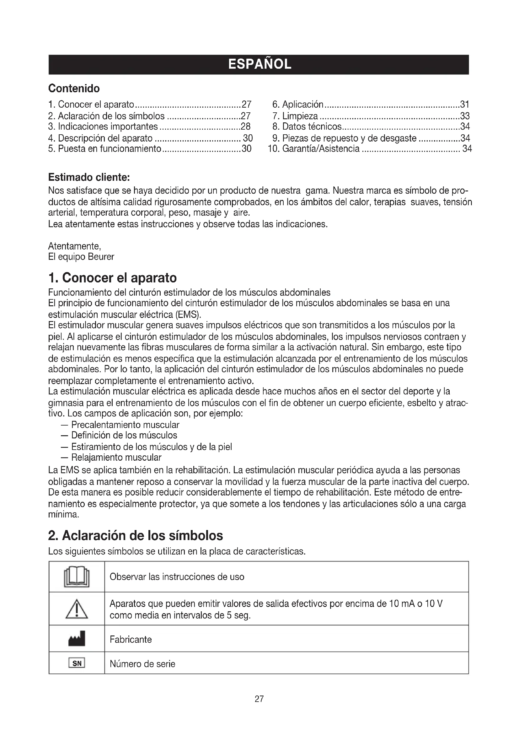mations peuvent être soulevées relatives à la responsabilité du fait des produits ou à d’autres disposi- tions légales obligatoires relatives à la responsabilité). Les réparations ou le remplacement complet ne prolongent en aucun cas la période de garantie.27 Estimado cliente: Nos satisface que se haya decidido por un producto de nuestra gama. Nuestra marca es símbolo de pro- ductos de altísima calidad rigurosamente comprobados, en los ámbitos del calor, terapias suaves, tensión arterial, temperatura corporal, peso, masaje y aire. Lea atentamente estas instrucciones y observe todas las indicaciones. Atentamente, El equipo Beurer