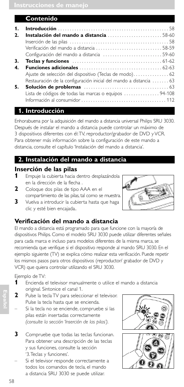 El mando a distancia está programado para que funcione con la mayoría de dispositivos Philips. Como el modelo SRU 3030 puede utilizar diferentes señales para cada marca e incluso para modelos diferentes de la misma marca, se recomienda que verifique si el dispositivo responde al mando SRU 3030. En el ejemplo siguiente (TV) se explica cómo realizar esta verificación. Puede repetir los mismos pasos para otros dispositivos (reproductor/ grabador de DVD y VCR) que quiera controlar utilizando el SRU 3030.
